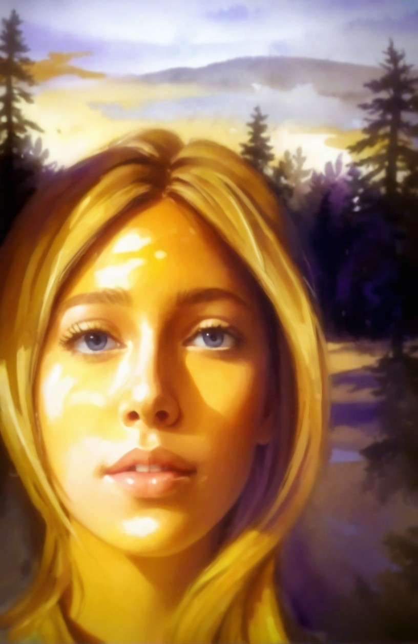 A serene portrait of a young woman with long blonde hair, set against a backdrop of mountains and a sunset, surrounded by silhouettes of pine trees, evoking a tranquil, natural atmosphere.