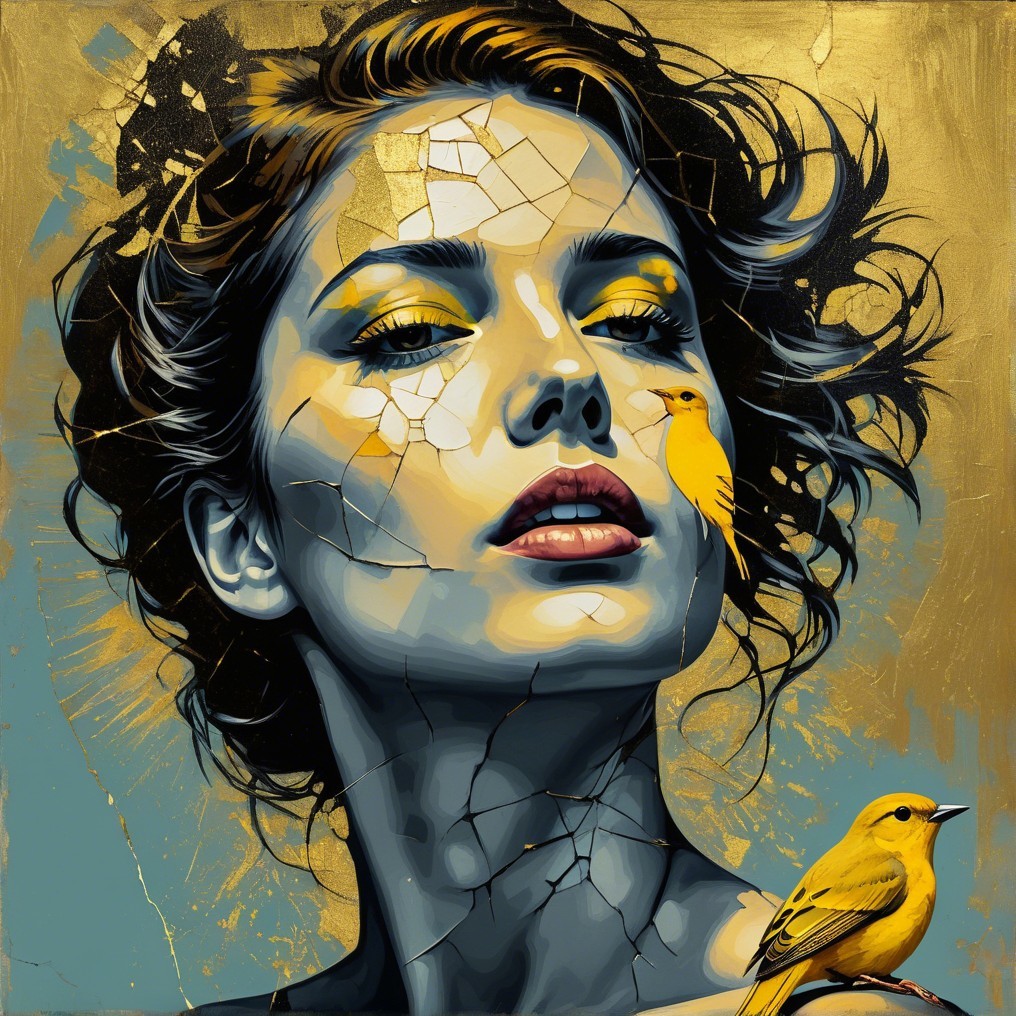 The artwork features a woman with cracked blue skin, symbolizing vulnerability, and a bright yellow bird perched near her face, contrasting beauty and fragility against a gold background.