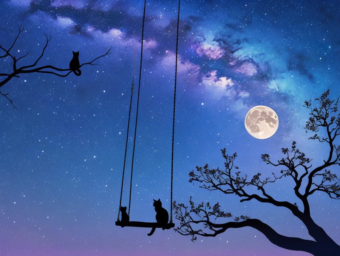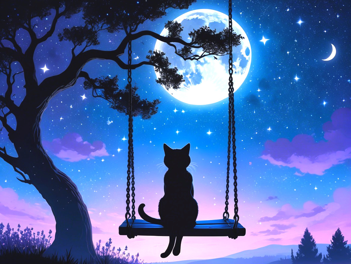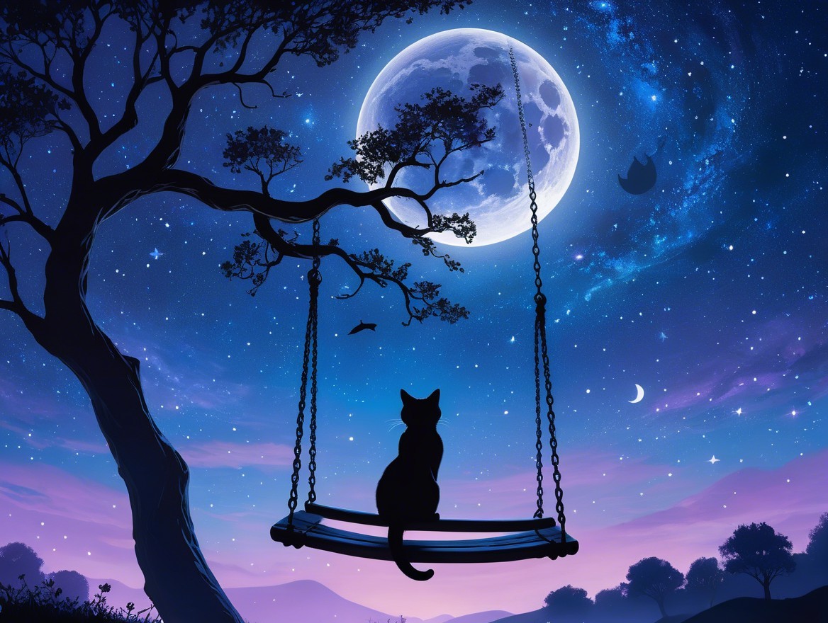 A serene night scene features a silhouetted black cat on a swing under a large moon. Stars twinkle in a vibrant sky, with hints of purple and blue, creating a tranquil, whimsical atmosphere.