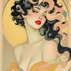 A glamorous woman with voluminous, wavy hair adorned with flowers gazes confidently. She wears an elegant attire, exuding vintage charm and allure against a dark background.