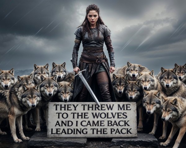 A central figure in a dramatic, flowing gown stands confidently amidst a chaotic crowd, blending elegance with intensity in a vivid, stylized composition. The contrasting emotions create a striking scene.