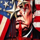 The image features a stylized, dramatic portrait of a man obscured by an American flag, with red paint or blood dripping, symbolizing a tense political commentary.