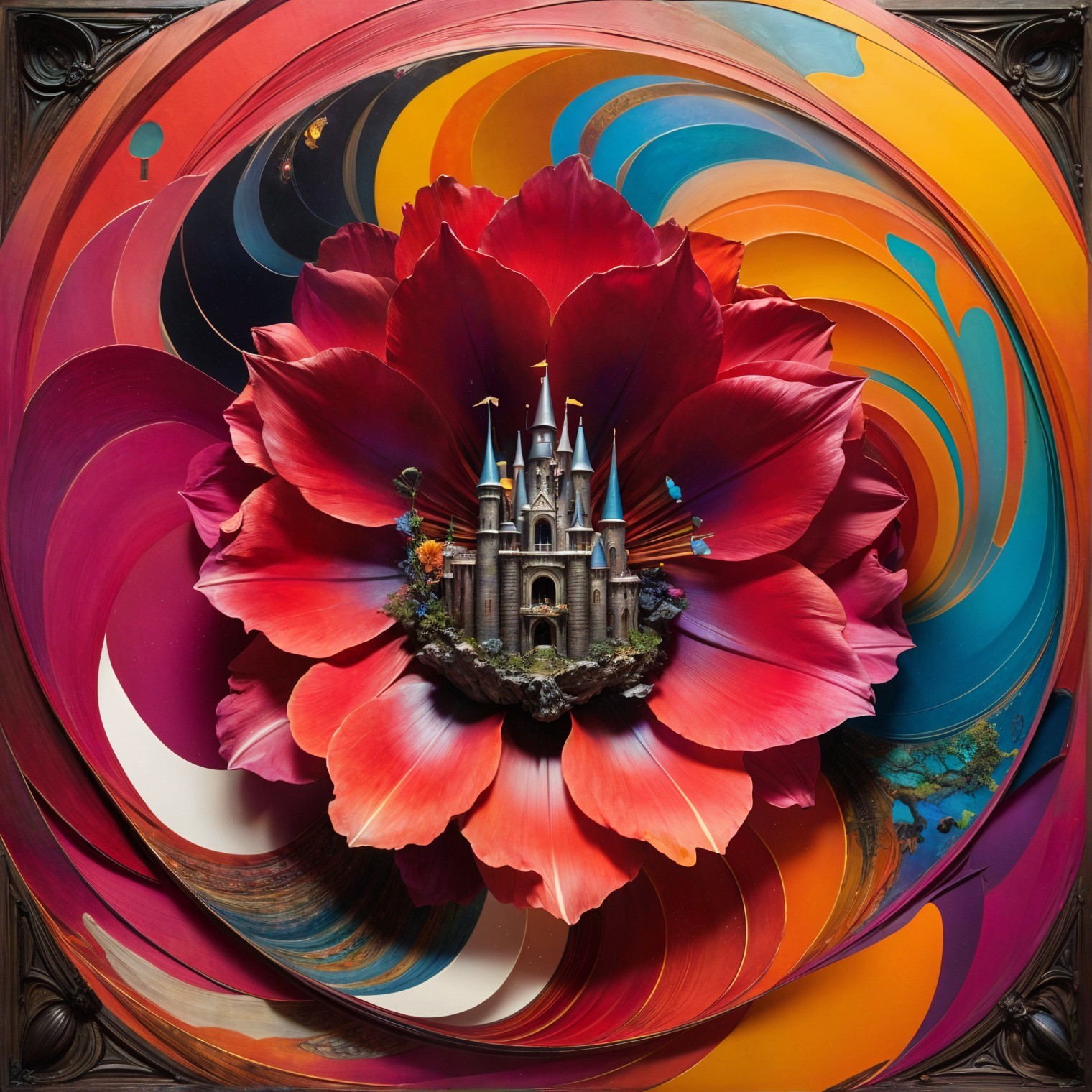 A vibrant, fantastical scene of a castle nestled within a large, colorful flower. The swirling patterns in the background create a dreamlike atmosphere, blending nature and magic.