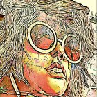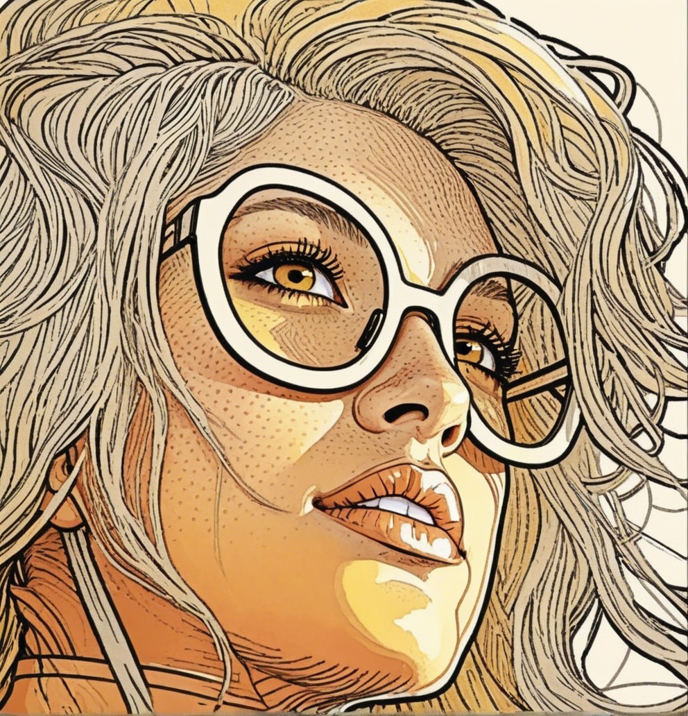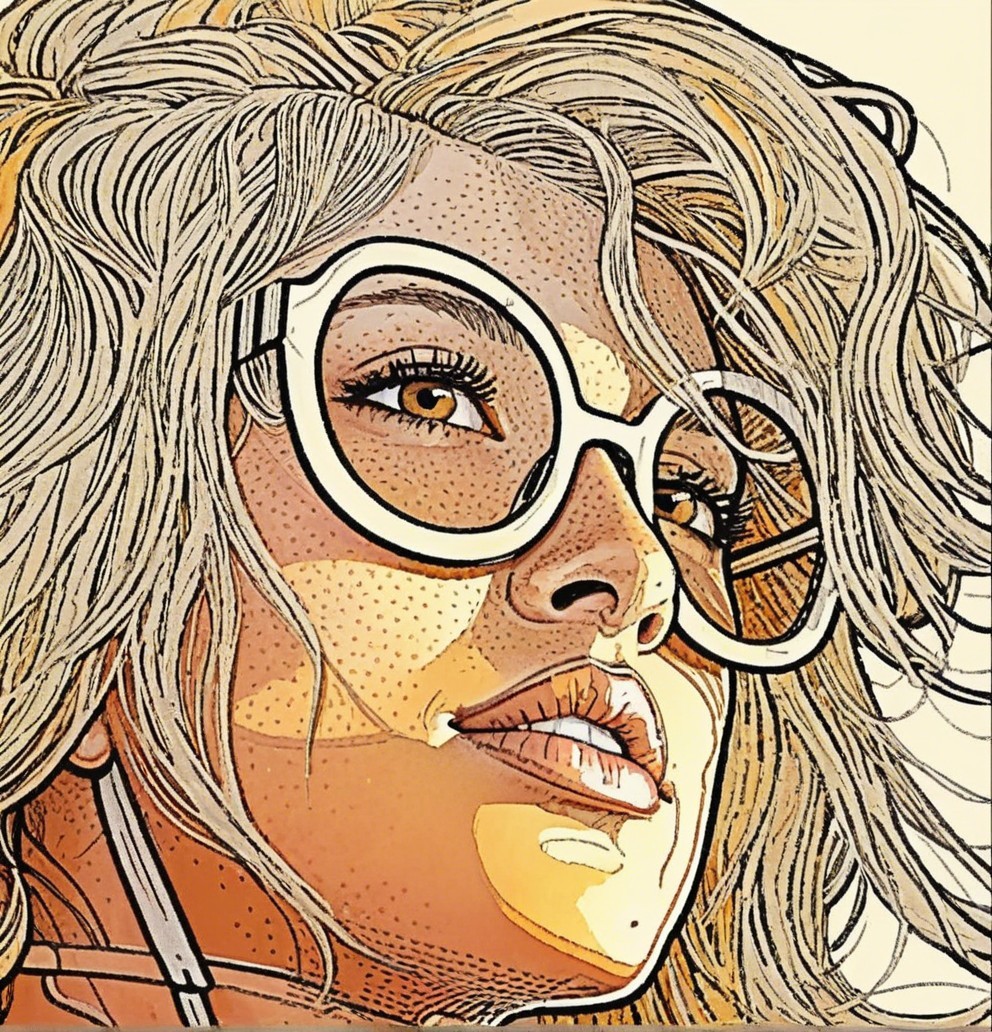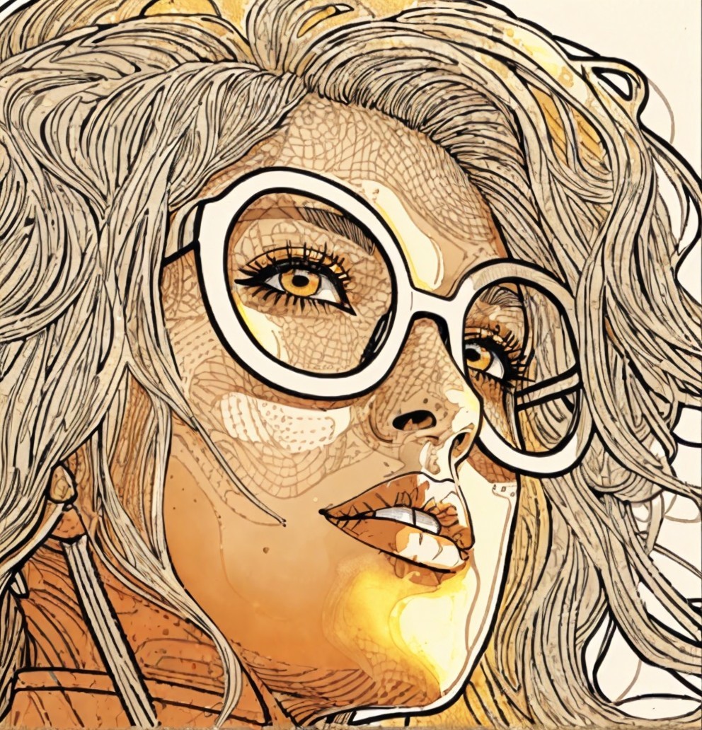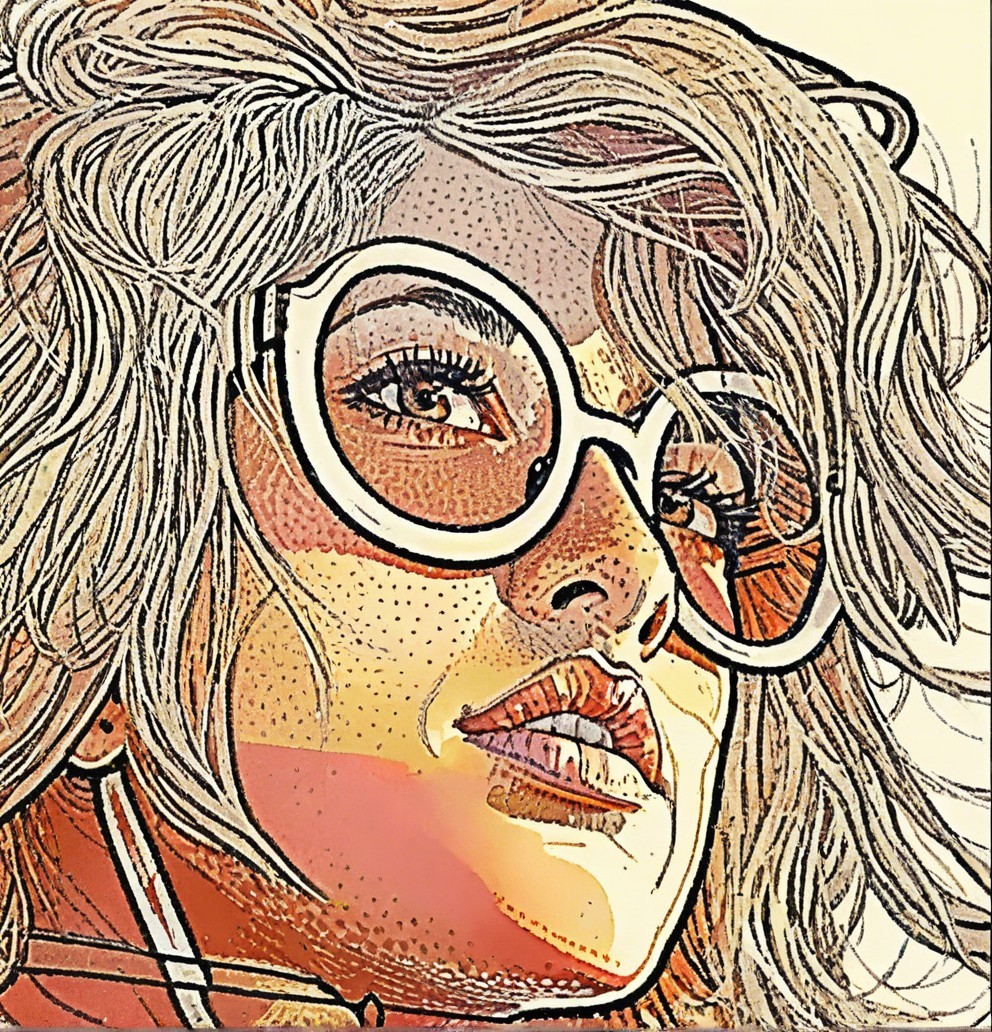 A stylish portrait of a woman with wavy hair, wearing large round glasses. The artwork features bold lines and vibrant colors, capturing a confident and artistic expression.