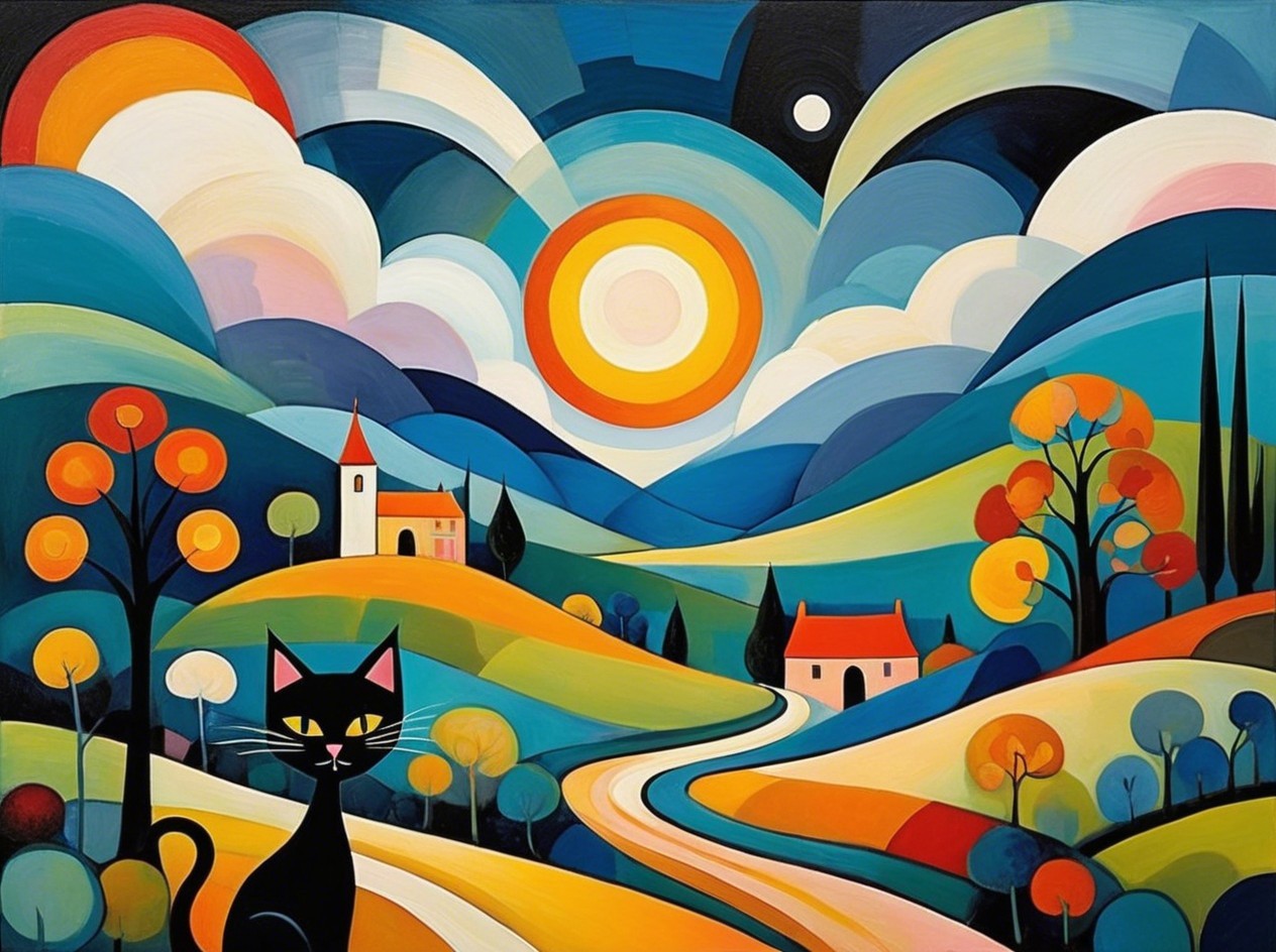 A stylized cat adorned with intricate gold patterns stands guard against a vibrant night sky, featuring swirling stars and a whimsical castle in the background, set on rolling hills.