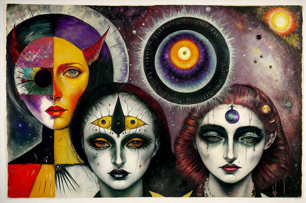 A surreal painting features three stylized faces with colorful cosmic elements and celestial bodies, blending human features with abstract space motifs.