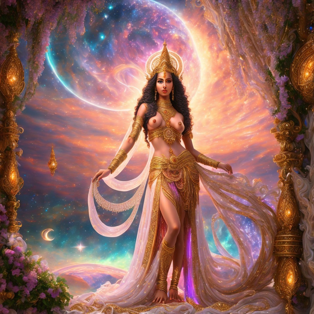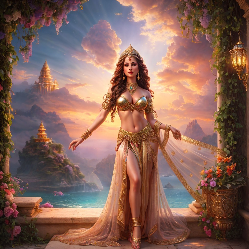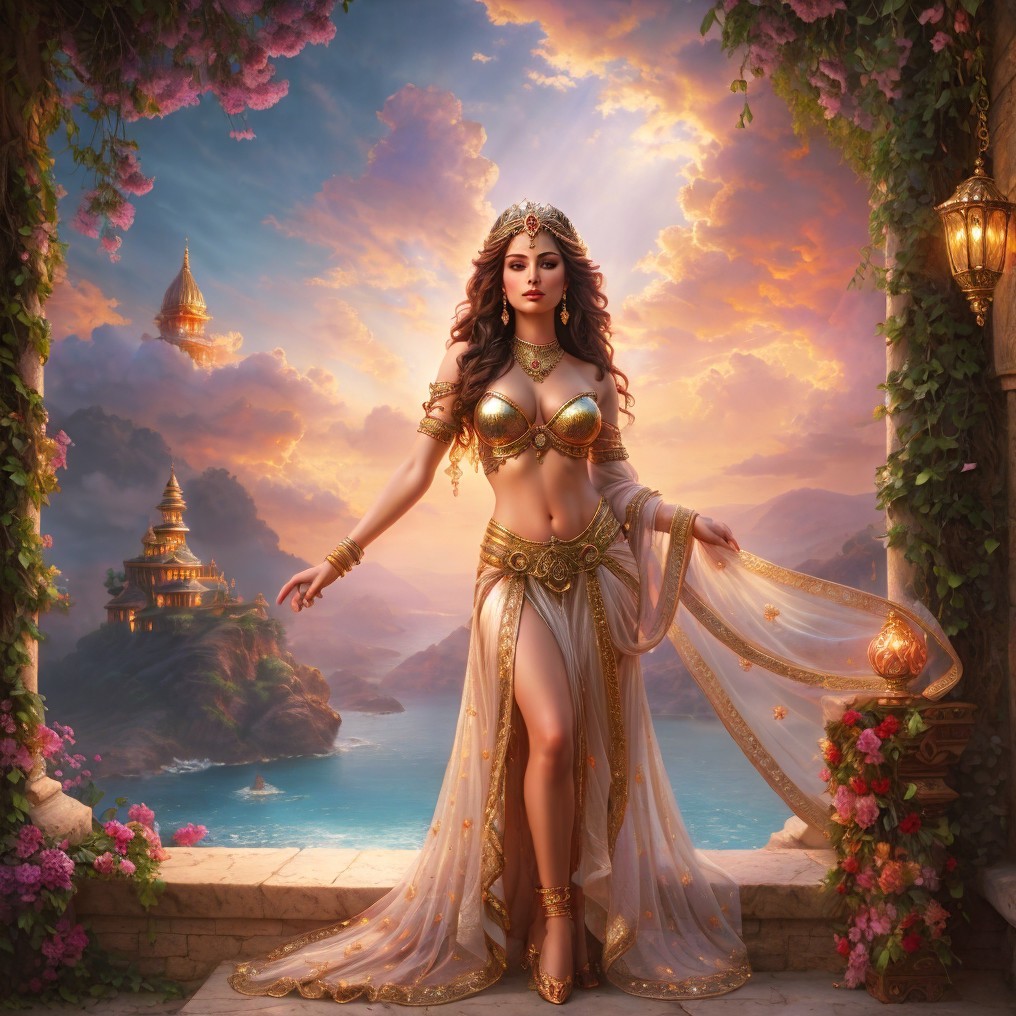 A regal woman in ornate attire stands before a fantastical castle backdrop with lush foliage and a twilight sky.