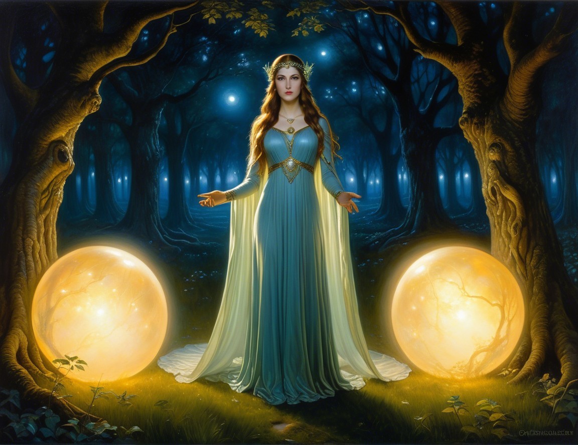 Elven Priestess standing between two glowing orbs in a magical grove at night, beautiful face; pointy ears, beautiful hands