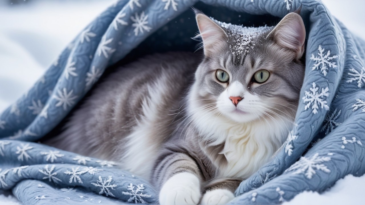 A fluffy gray and white cat rests comfortably in a cozy blue blanket adorned with snowflakes, with a light dusting of snow on its fur, creating a serene winter scene.