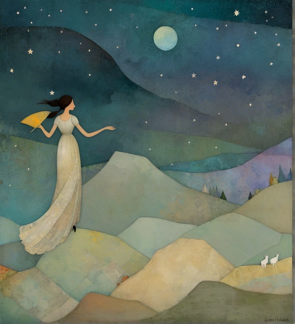 A woman in a flowing white dress hovers above a colorful town under a starry night sky. She holds a fan in one hand and a pocket watch in the other, surrounded by soft clouds and mountains.