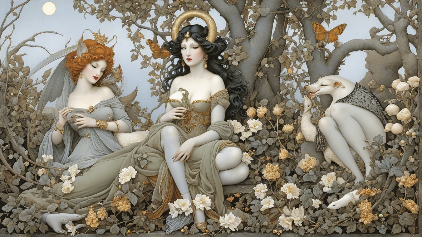 Lady of the night is dark and full of beautiful magic. She had been born with a face that would let her get her way Big".in the style of Michael Parkes. 3rd century Persian miniature art, golden ochre, sage green, pearl grey, paprika, blue-grey, Velvet Black, Shabby, Dull Gold, Amber Gray, Golden Ratio, Surreal Fantasy, Elegant, High Definition Ultra Fine 3D Line, Zenangle Style, Watercolor Patchwork , Arthur Rackham Style, Paul Kidby, , Jacek yerka, Extremely Detailed, Intricate, Thoughtful, HDR, Fractal, Beautiful, Award Winning, Fantasy Look, Fantasy, Crisp Quality