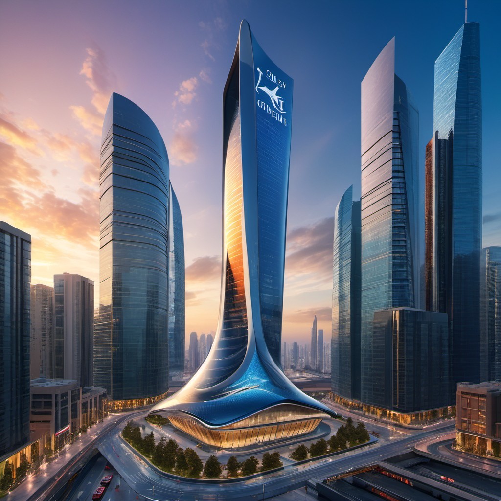 Futuristic skyscrapers with sleek designs against a sunset sky, showcasing advanced architecture and vibrant city life.