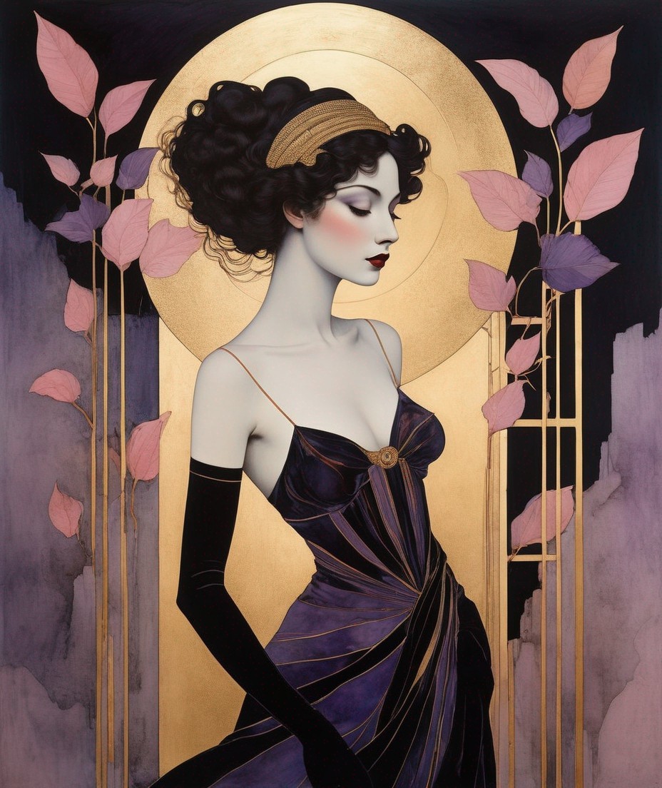whimsical, beautiful, poignant, touching. colors pink, violet, gold, rust, indigo, burgundy, black. soft watercolor extra water in Art Deco by Annigoni, Egon Schiele, Milo Manara, Botticelli, Catrin Welz-Stein, Jean Metzinger, Klimt, perfect eyes, perfect hands face , highly detailed, complementary colors, hyper detailed. Watercolor and ink splatter, dynamic pose,