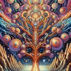 A vibrant, mystical tree with intricate branches and colorful orbs extends towards a starry sky. Below, a serene landscape meets the ocean, evoking a sense of connection to nature and the cosmos.