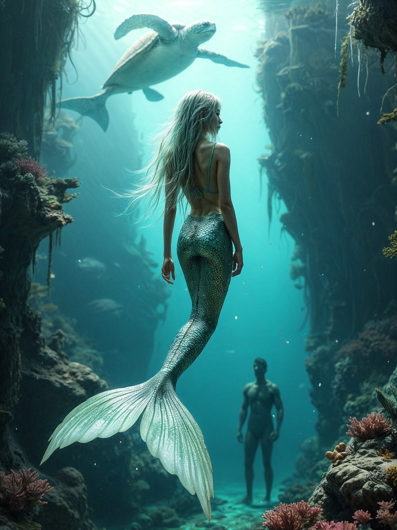 A graceful mermaid with flowing hair swims through a vibrant underwater scene, surrounded by colorful fish and coral, illuminated by beams of sunlight filtering through the water.
