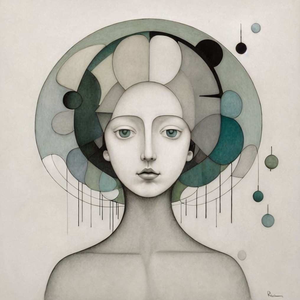 The artwork features a stylized, monochromatic portrait of a woman with a geometric design surrounding her head. Bold shapes and lines create an abstract, thought-provoking composition.