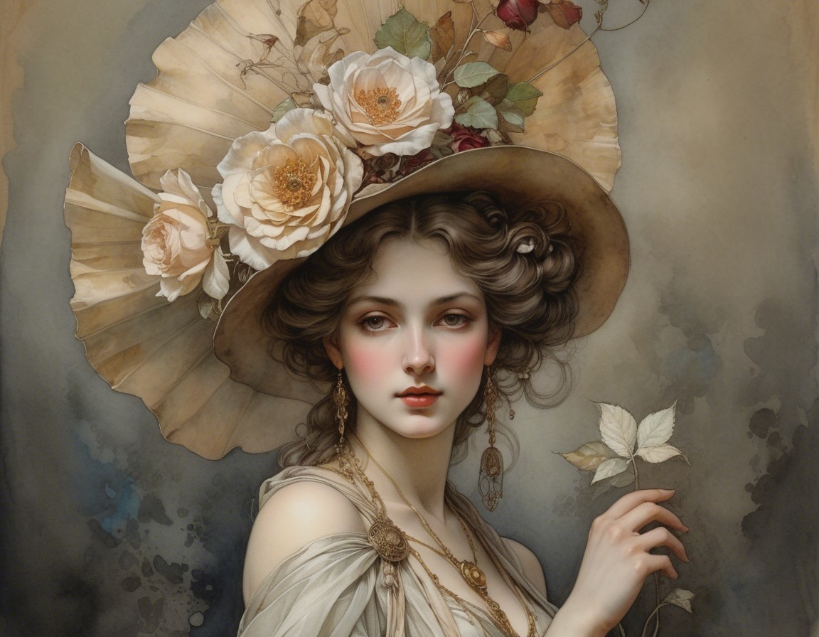 A beautifully detailed portrait of a woman adorned with a large floral hat and delicate roses, exuding elegance and grace, set against a muted background that enhances her features.