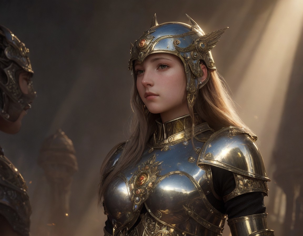 A woman in ornate medieval armor with a helmet stands in a cathedral with rays of sunlight illuminating her.