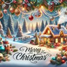 A cozy, snow-covered cabin adorned with Christmas lights sits among decorated evergreen trees. Colorful ornaments and gifts surround the scene, with "Merry Christmas" elegantly scripted.