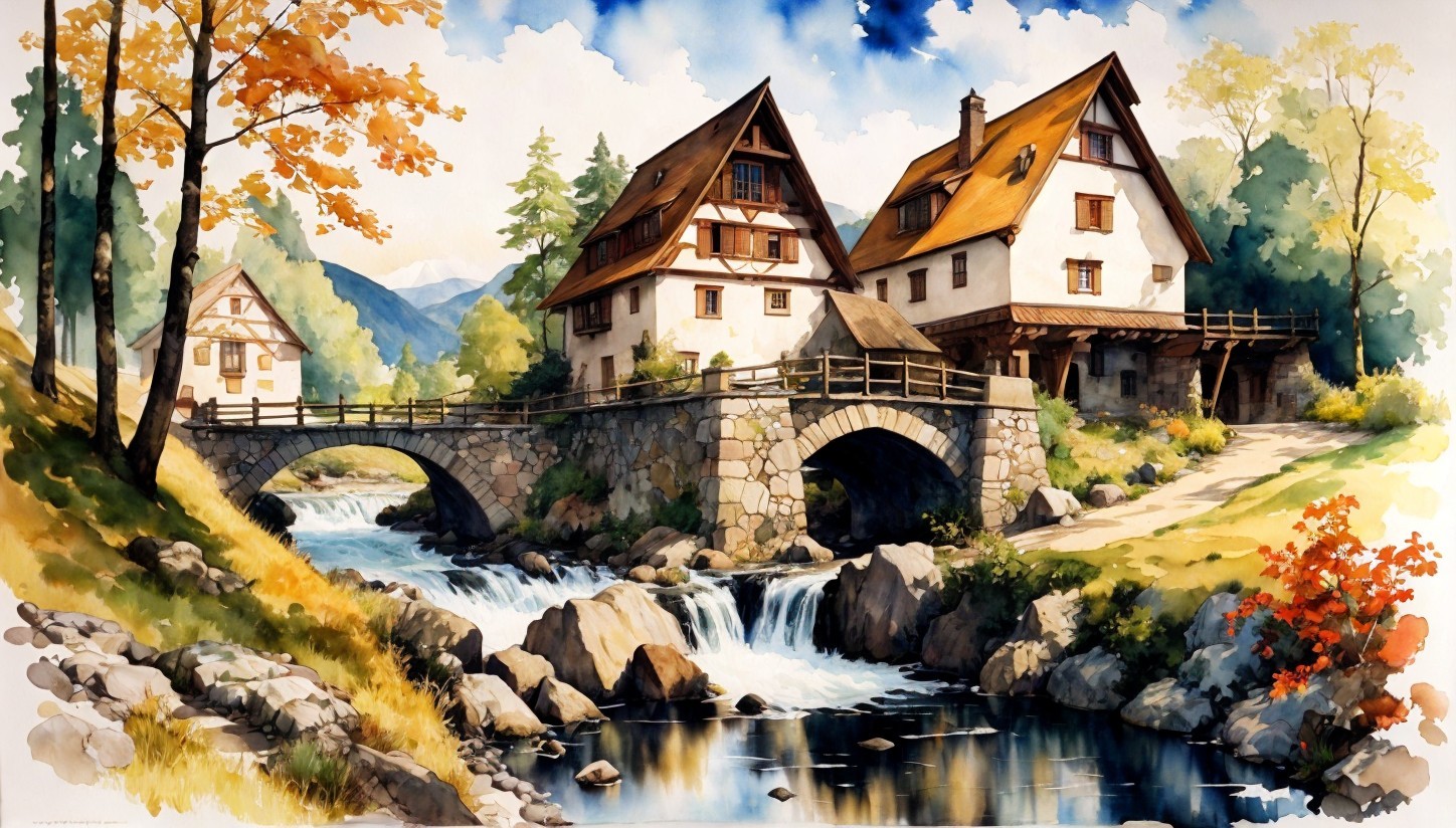Idyllic countryside scene with stone bridge, stream, and traditional houses amidst vibrant foliage under a clear sky.