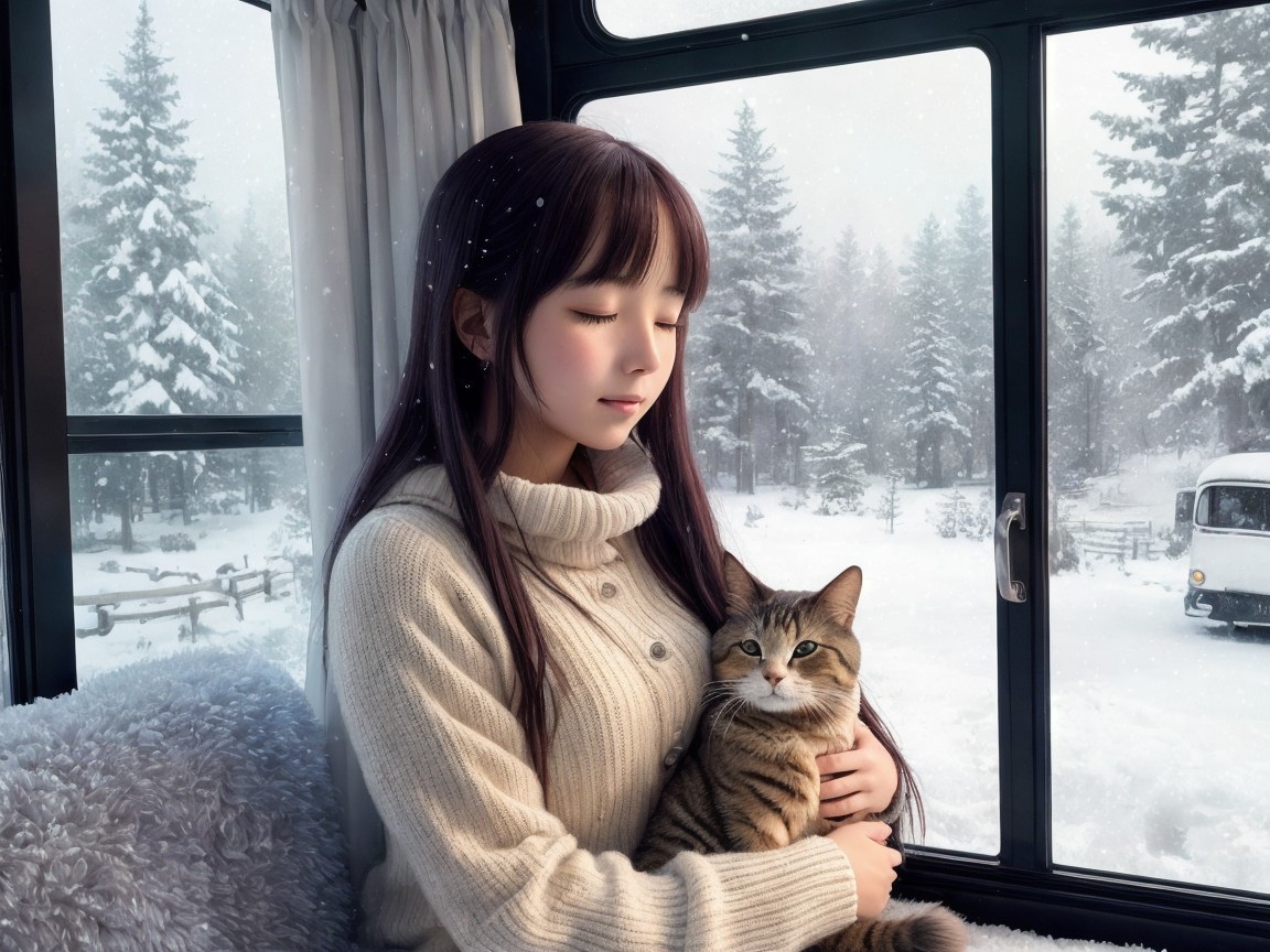 A serene winter scene shows a girl in a cozy sweater, gently holding a cat while gazing out of a bus window. Snow covers the landscape, creating a tranquil and heartwarming atmosphere.