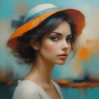 A young woman with a soft expression wears a wide-brimmed hat adorned with a green ribbon. Her lush hair frames her face, set against a blurred, colorful urban background.