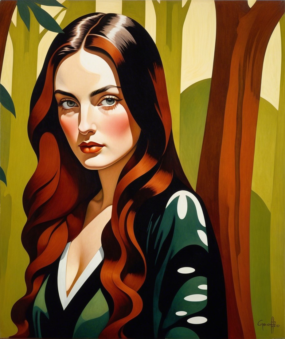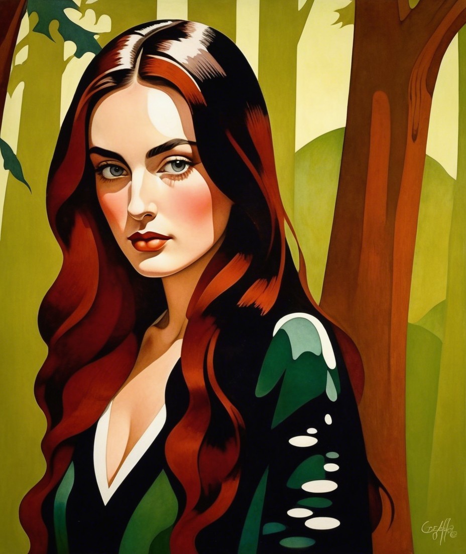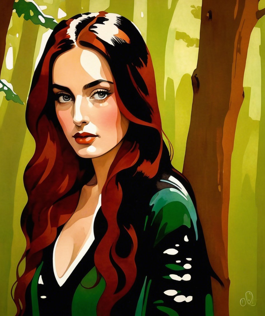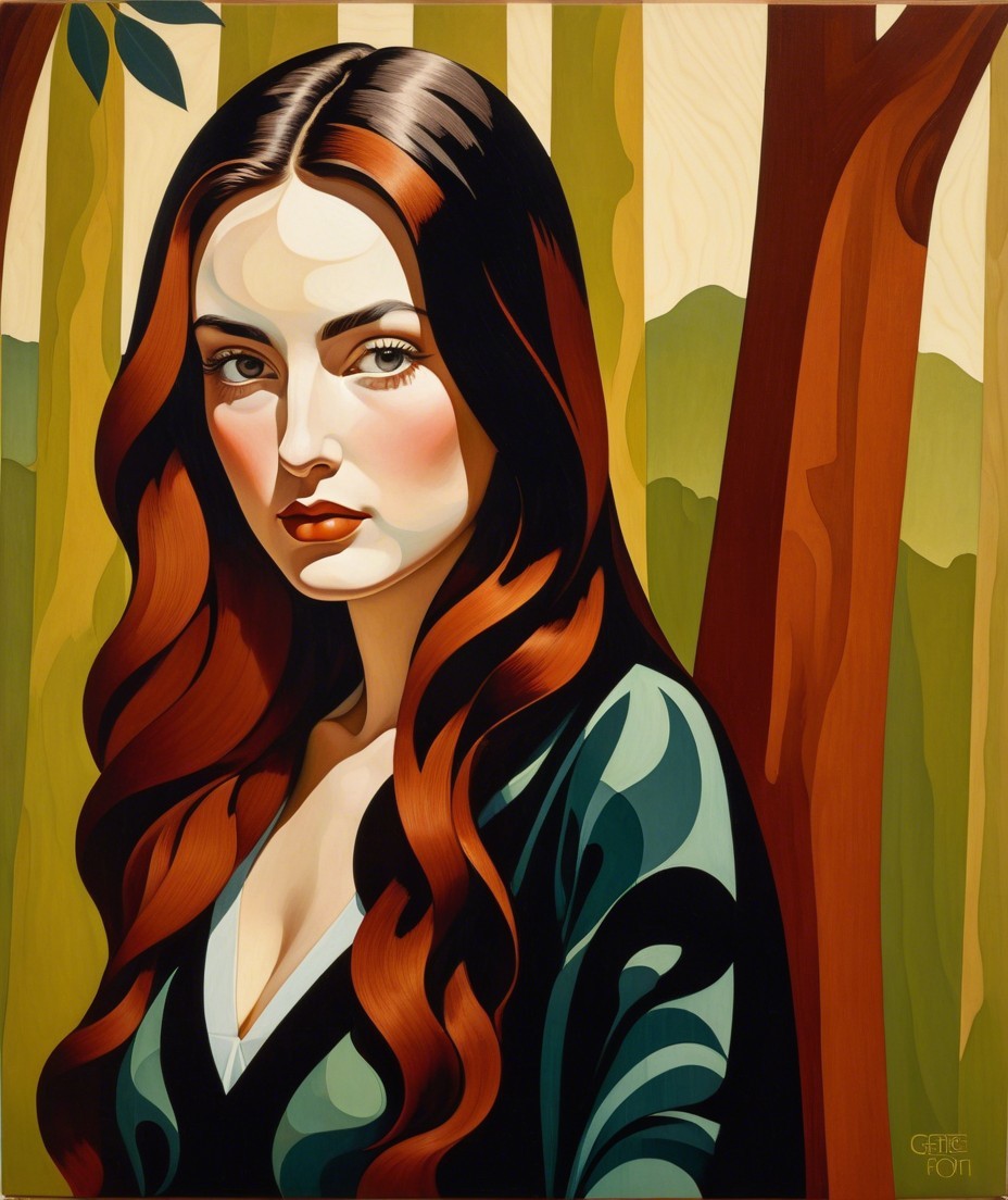 Stylized woodblock print by Georgia O'Keeffe,headshot, tesselated, sculpted, rim lighting, Vintage style, sqiggly lineage, devilish eyes 1.7, fractal line patterns, Stylized tesselated Portraiture with flowing hair illusion, foampunk, reminiscent of expressionistic fractalization, splash ink technique, aquatint, black ink lines, watercolor effects, tesselated cottagegore 1.5, tetradic color scheme auburn green mauve pistachio-green, hues,, stylization 1.3, raytraced shadows 1.8.. Watercolor wash, soft green and brown hues, soft rounded edges, quilling, crackles, delicate coloring 1.3, withered , warm pale colors, american gothic 1.7, rim dynamic lighting, dusk, raytraced shadows, stylized natural details, golden hour, bold color strokes,