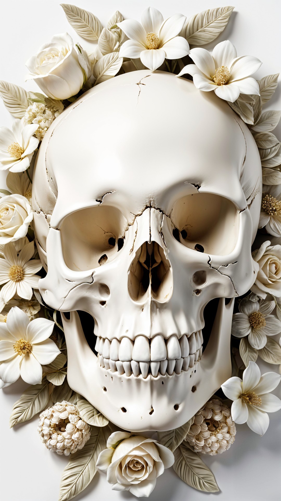 White Skull Surrounded by Pale Flowers and Cracks