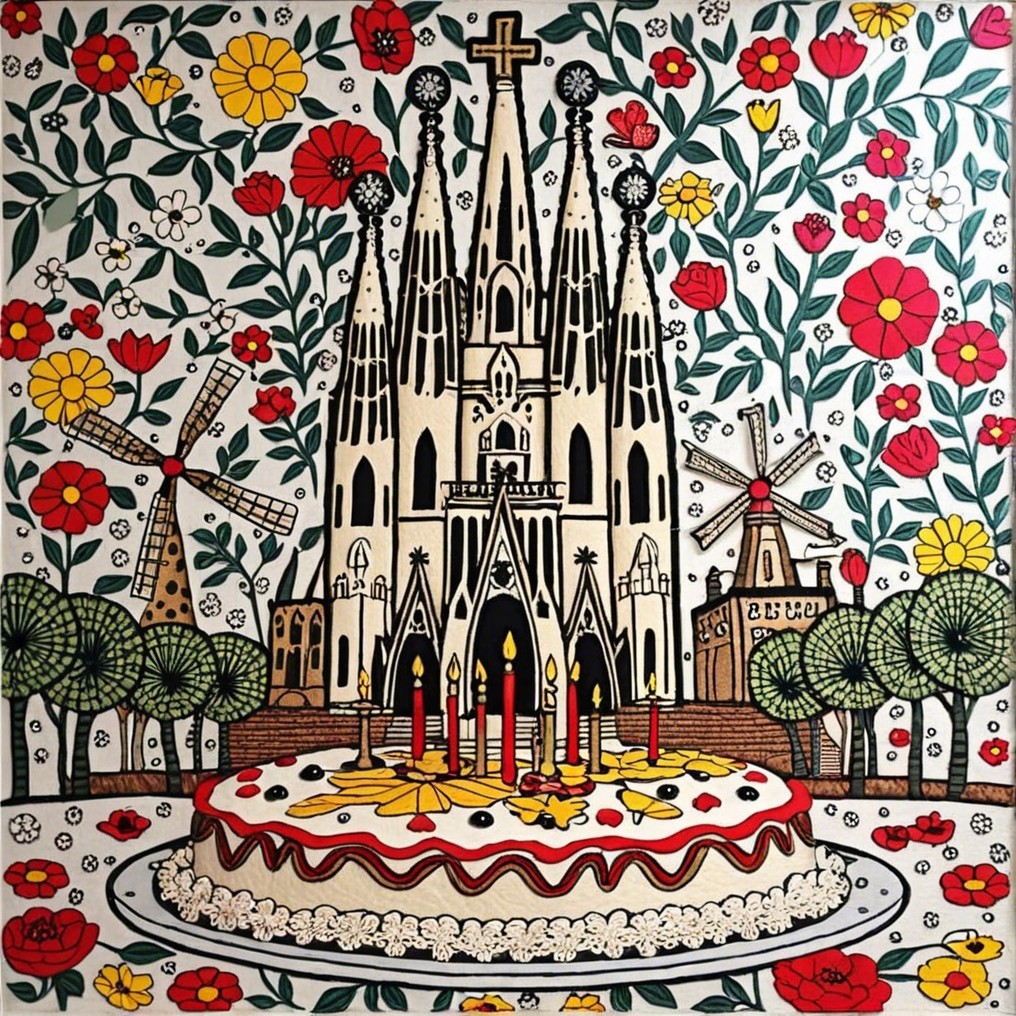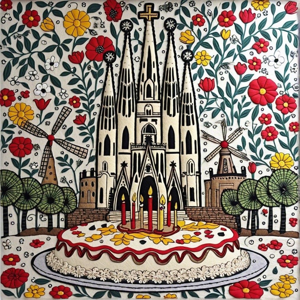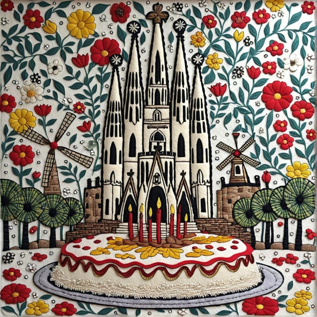 Gothic Cathedral Embroidery with Cake and Windmills