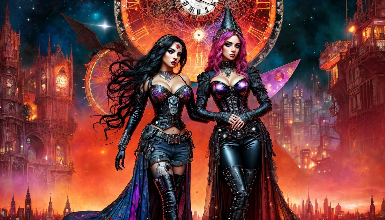 Prompt: Witches of beauty trapped in machine, discovering new cosmic spell, mixed media collage, textured, layered, assemblage, inspired by Brian Viveros and Esao Andrews, add surrealist details. Cosmic, cityscape machines in clockworkpunk. , design by Dave McKean, backdrop is weird Machine, unframed. vibrant colours Modifiers: beautiful ultra detailed colourful fine art Gustav Klimt H.R. Giger Enki Bilal by Paul Klee Dave McKean clockworkpunk double exposure merging