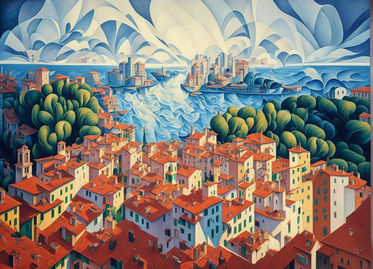 A vibrant, abstract cityscape with colorful rooftops, lush green hills, and a sparkling blue sea. Tall buildings rise in the distance under a dynamic, swirling sky, creating a lively atmosphere.