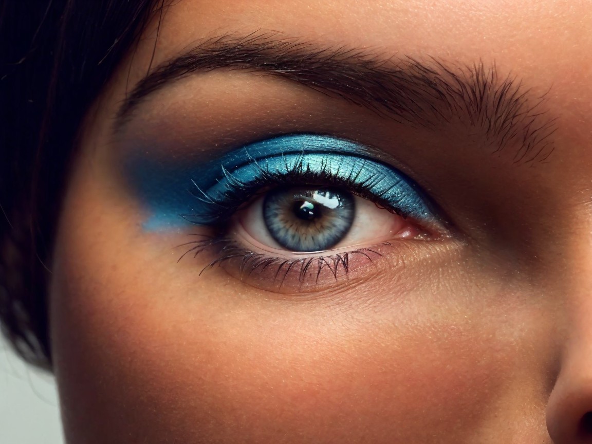 The close-up features an eye with striking turquoise eyeshadow and a bold winged shape. The warm brown iris contrasts beautifully with the vivid color, creating a captivating look.