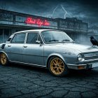 A vintage silver car with gold rims parked in an abandoned area. The background features a dilapidated building and a prominent "SKODA" sign, creating an intriguing and nostalgic atmosphere.