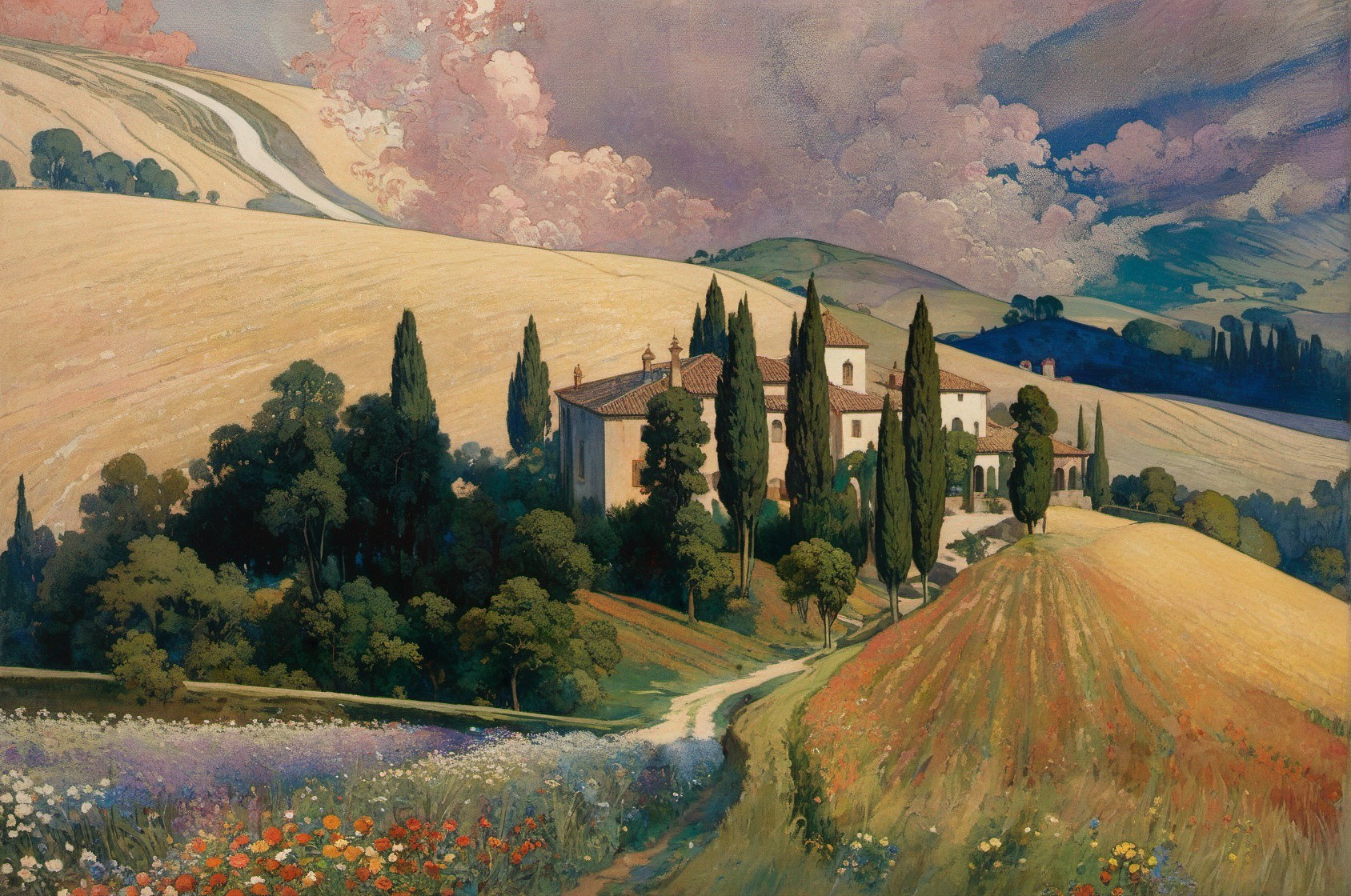 Prompt: Tuscan landscape, flowers, swirling clouds, style by Cornelis Springer, by Harry Clarke, Walter Crane, intricate detailed, coloured, multicolour