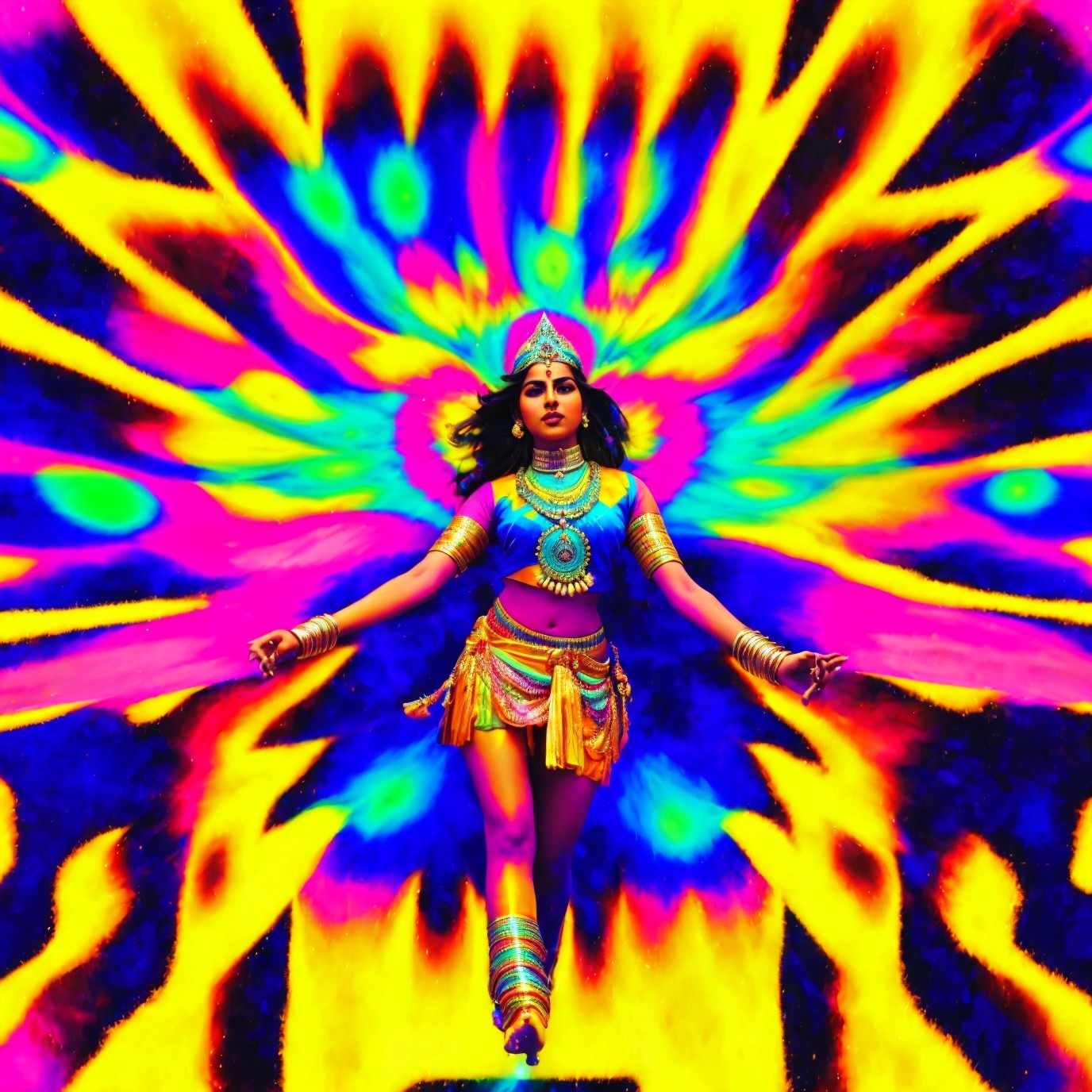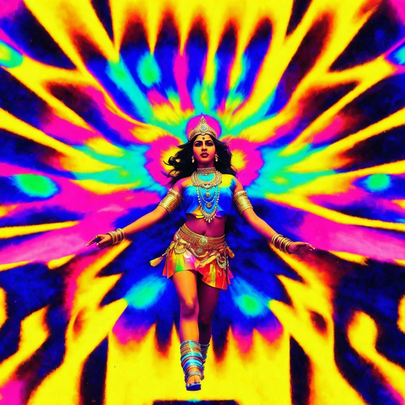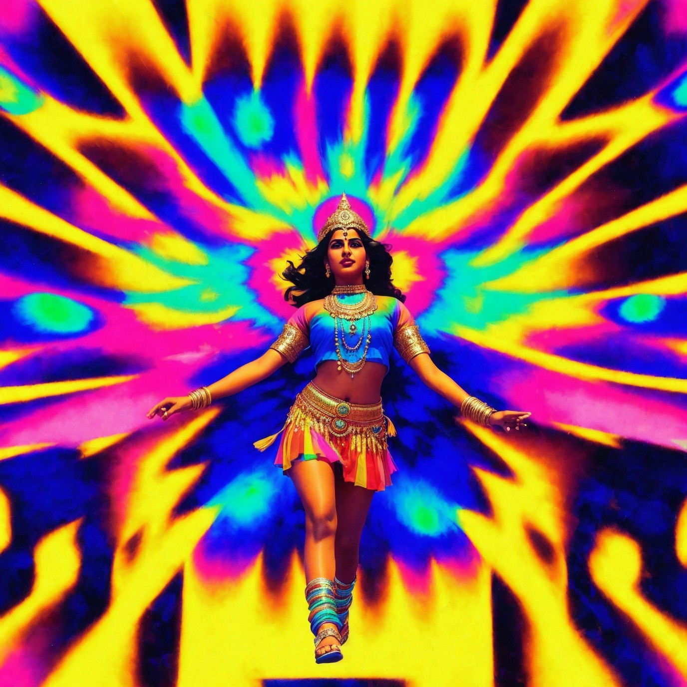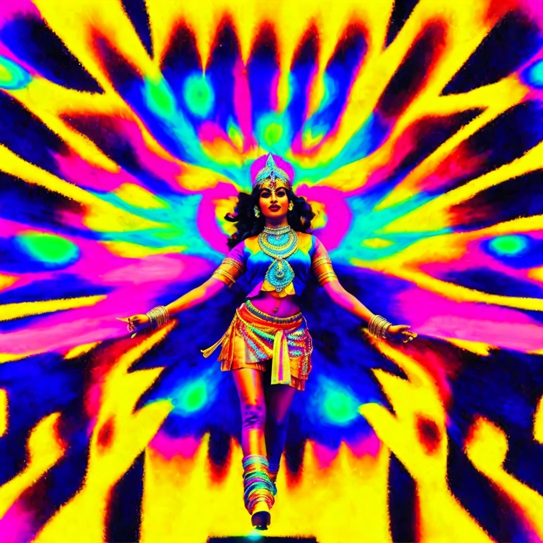Brahma flying in the street. Bollywood 1960s style. Graffiti.