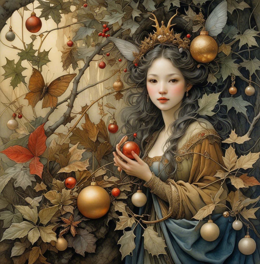 A serene, ethereal woman adorned with autumn leaves and festive ornaments stands amidst trees, with birds perched on her shoulders and vibrant red spheres accenting her elegant attire.