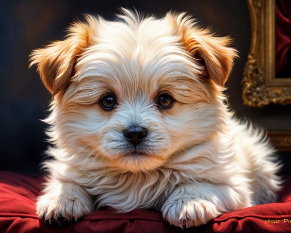 A charming scene features a polar bear and its cub in a snowy landscape. Both wear bright red scarves, with the adult bear holding a cylindrical object while gazing affectionately at the cub.