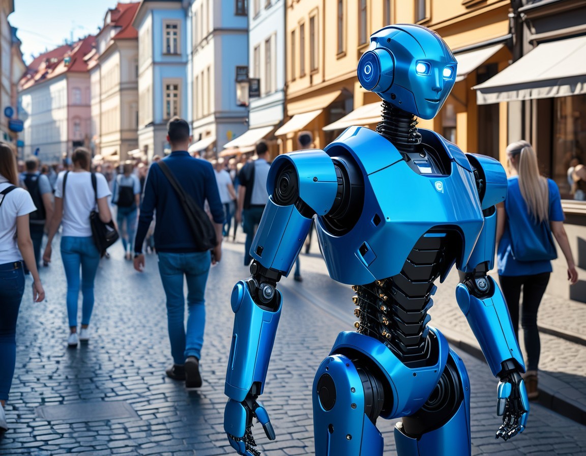 In a vibrant cityscape of Prague, a massive humanoid robot in a cyberpunk cornflower blue hue roams the bustling streets, interacting with the lively urban environment on a sunny day.