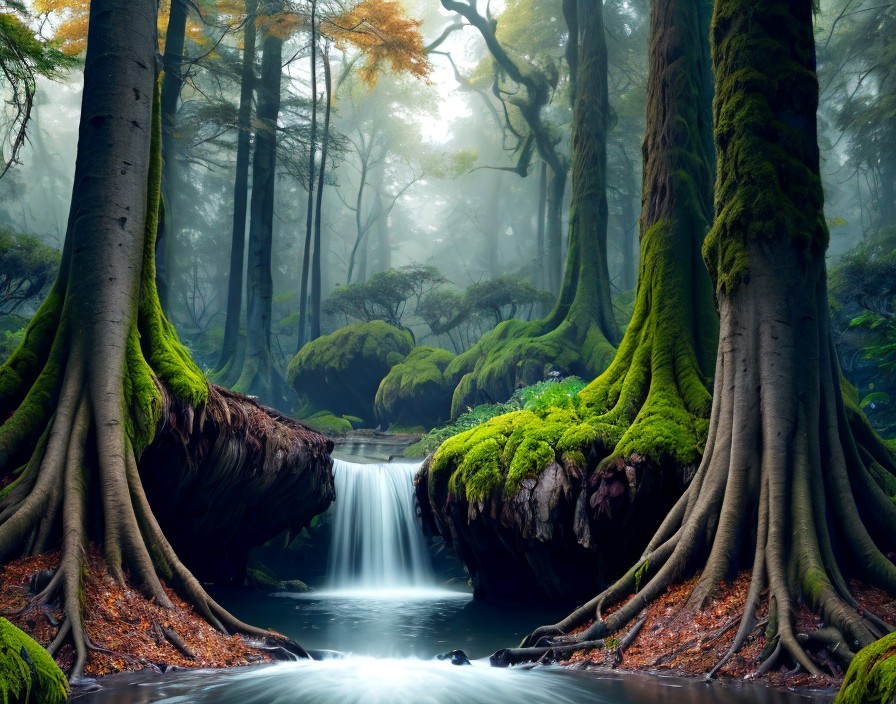 (Try it from other user) - A serene forest with moss-covered trees, a small waterfall, and mist hanging among the branches.