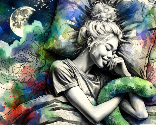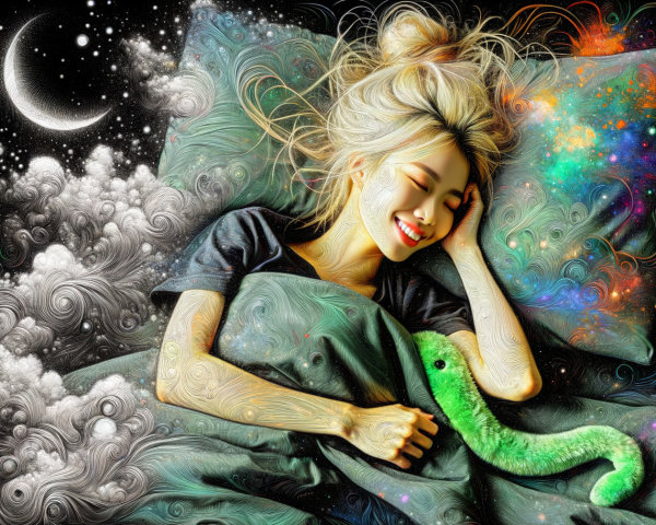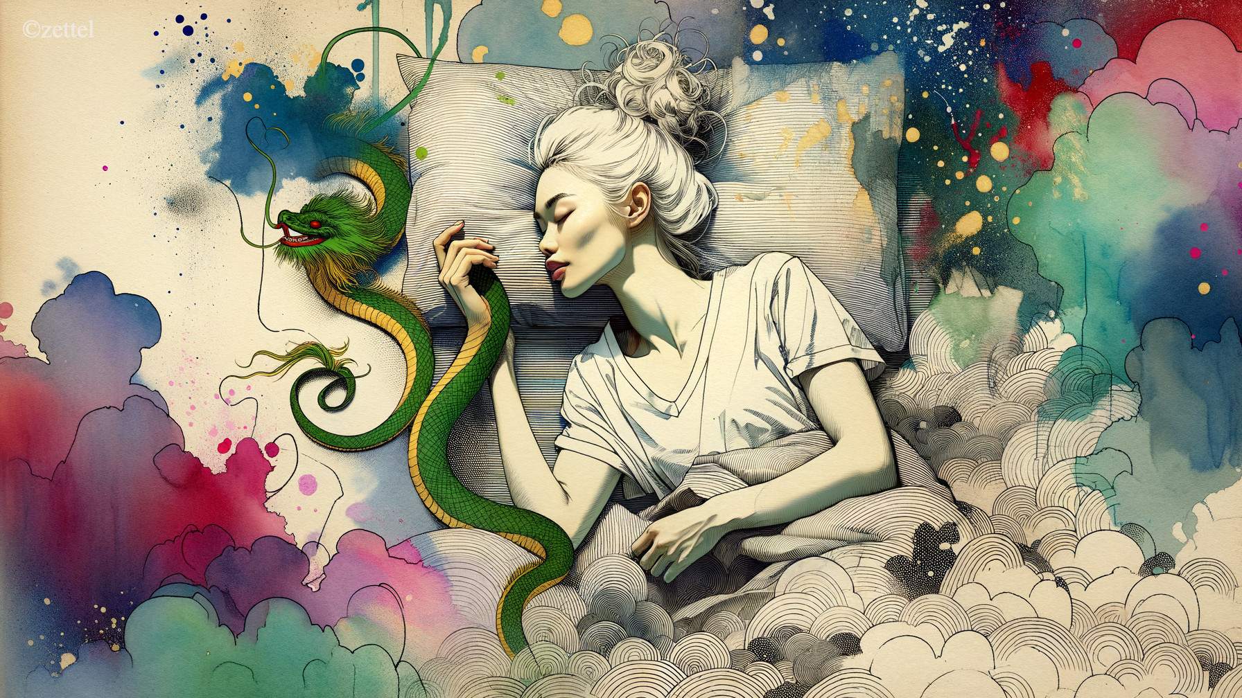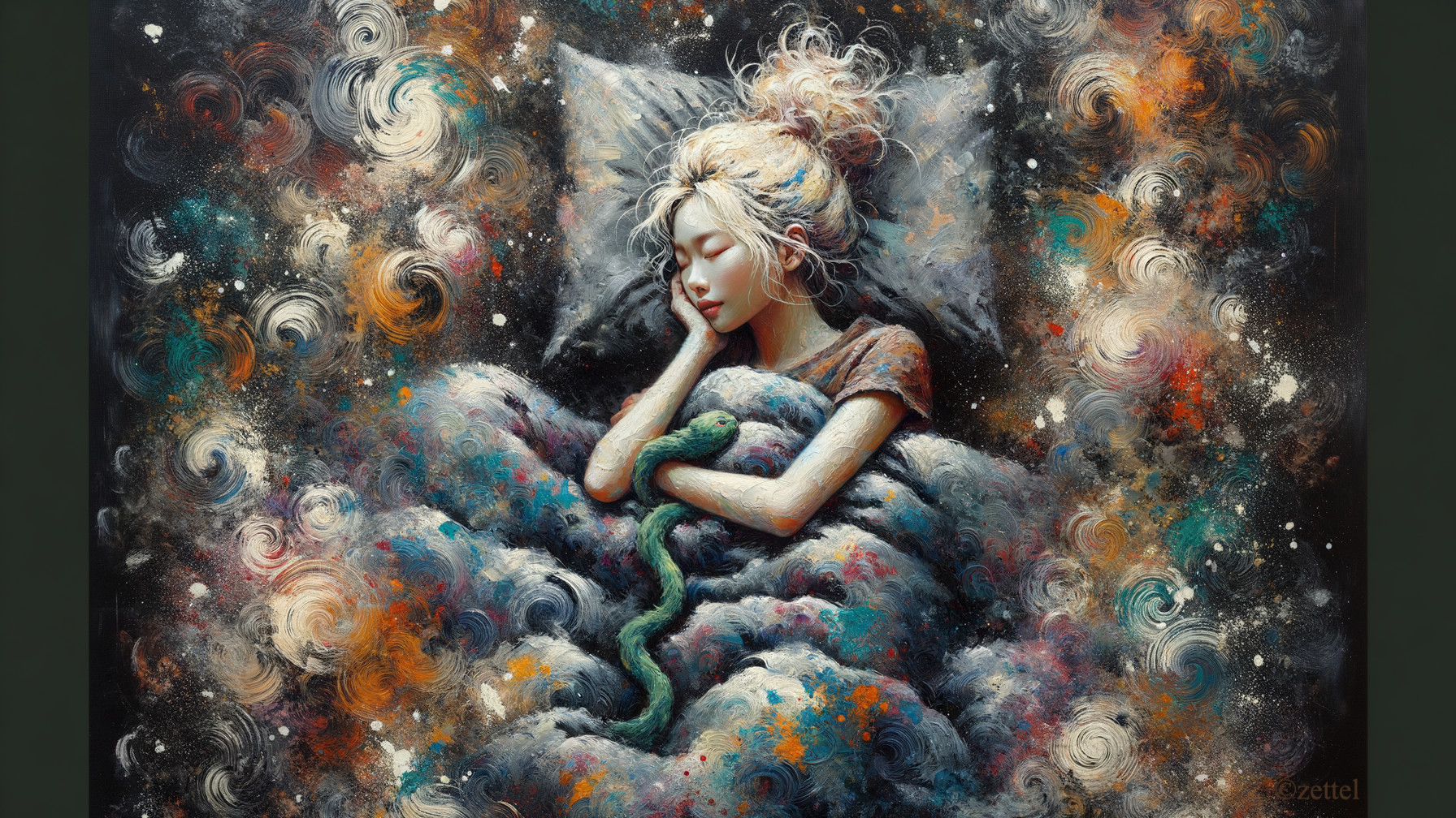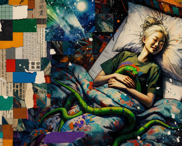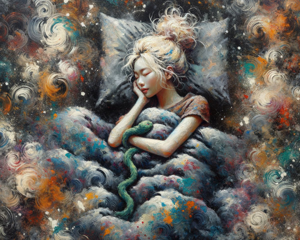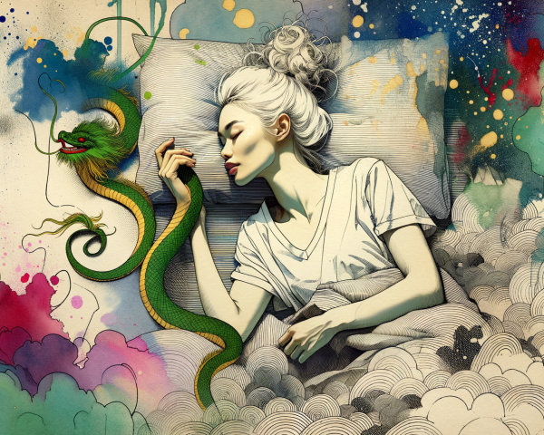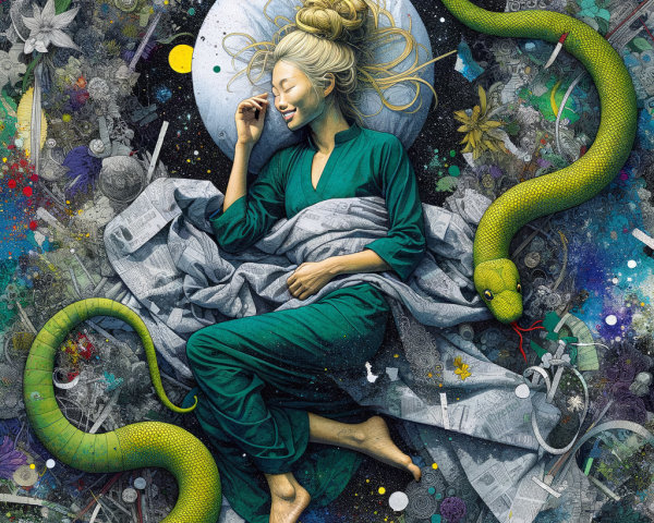 A serene woman with long hair sleeps peacefully, wrapped in a green robe. Surrounding her are vibrant patterns, flowers, and a coiled green snake, evoking a dreamlike, surreal atmosphere.