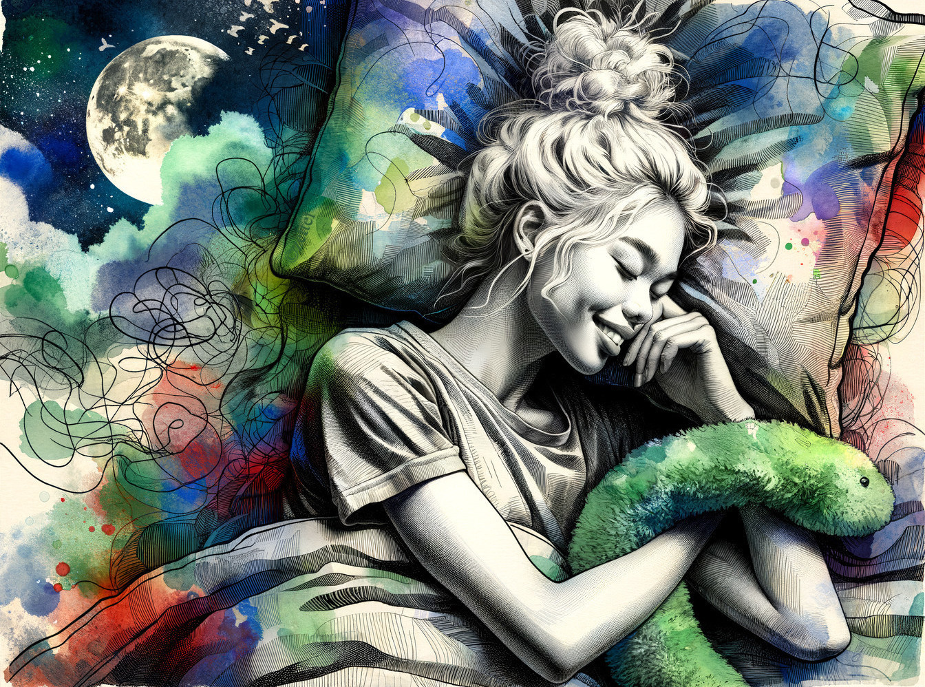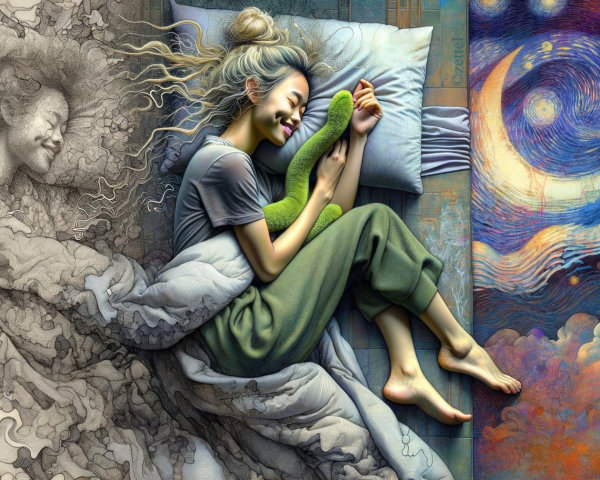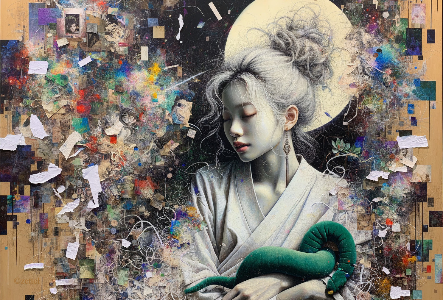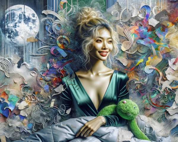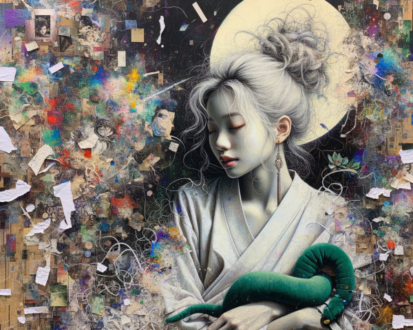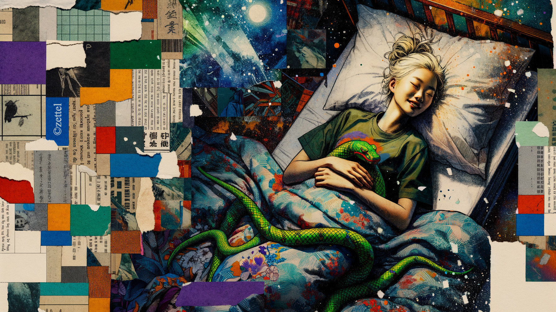 A serene woman with long hair sleeps peacefully, wrapped in a green robe. Surrounding her are vibrant patterns, flowers, and a coiled green snake, evoking a dreamlike, surreal atmosphere.