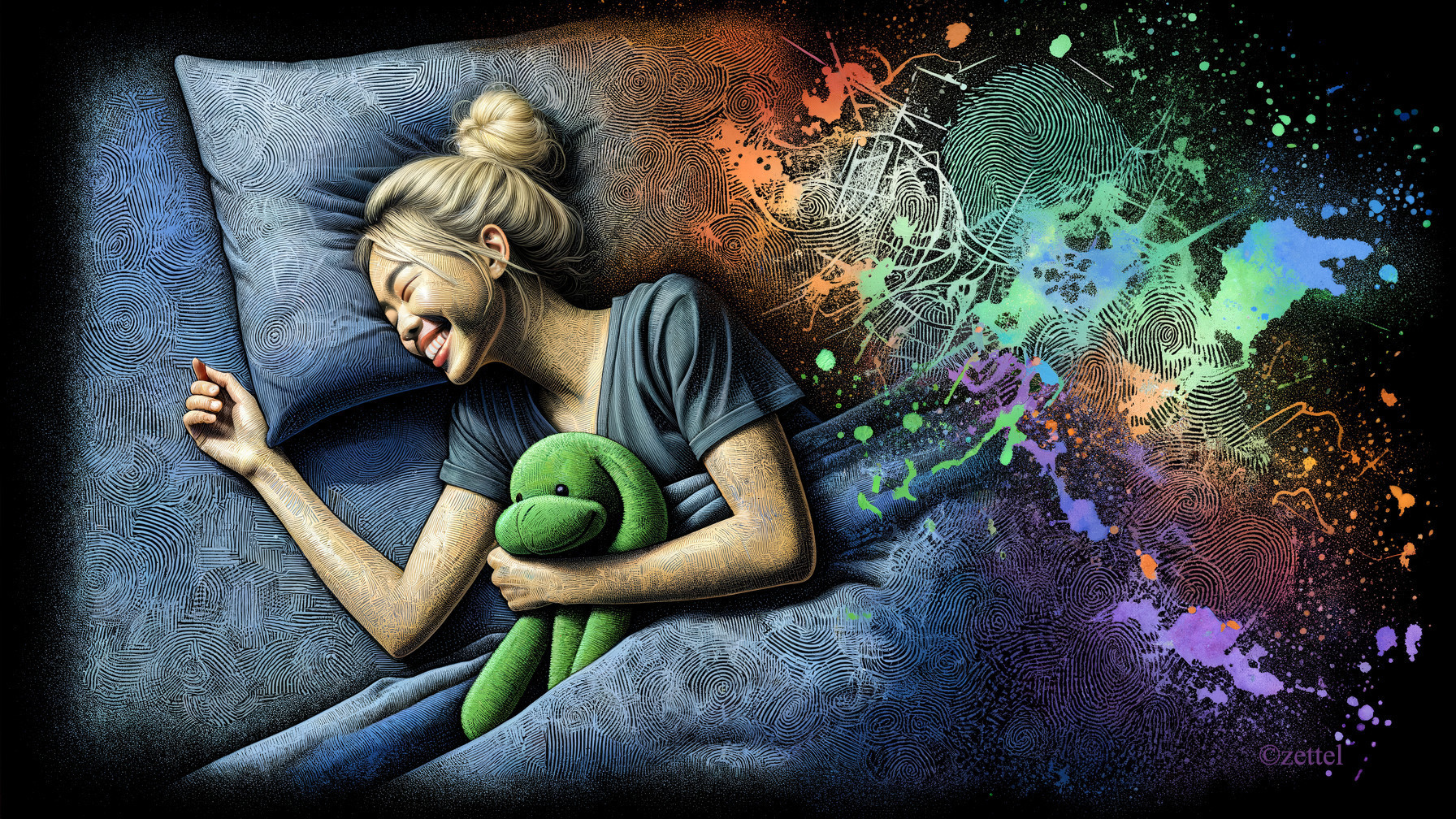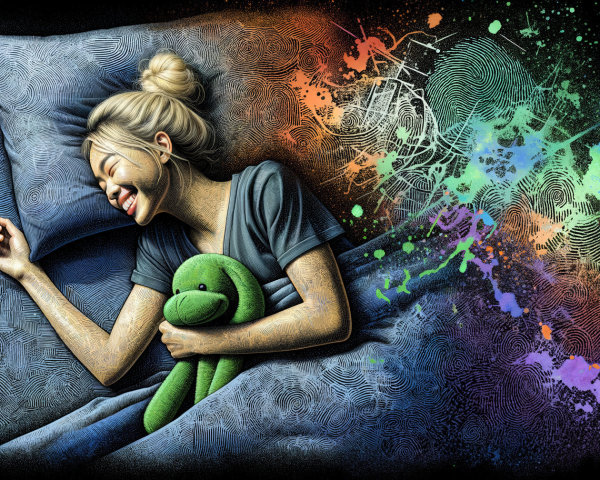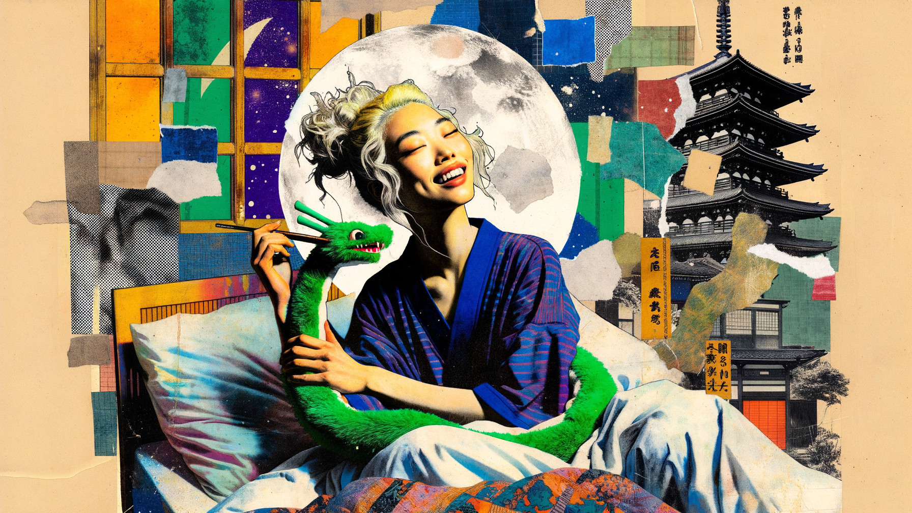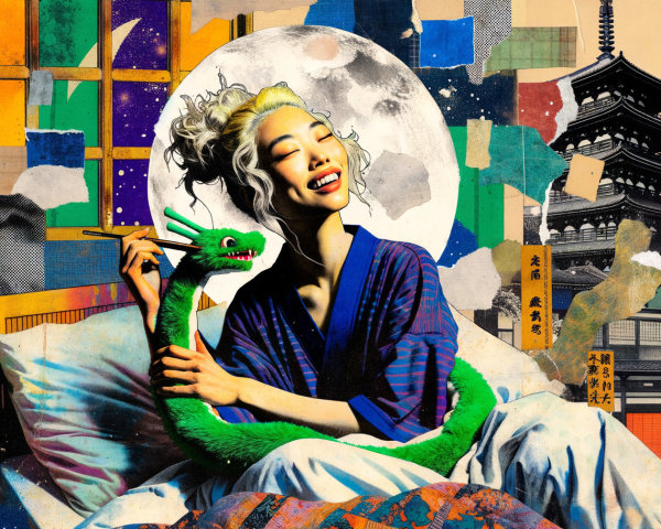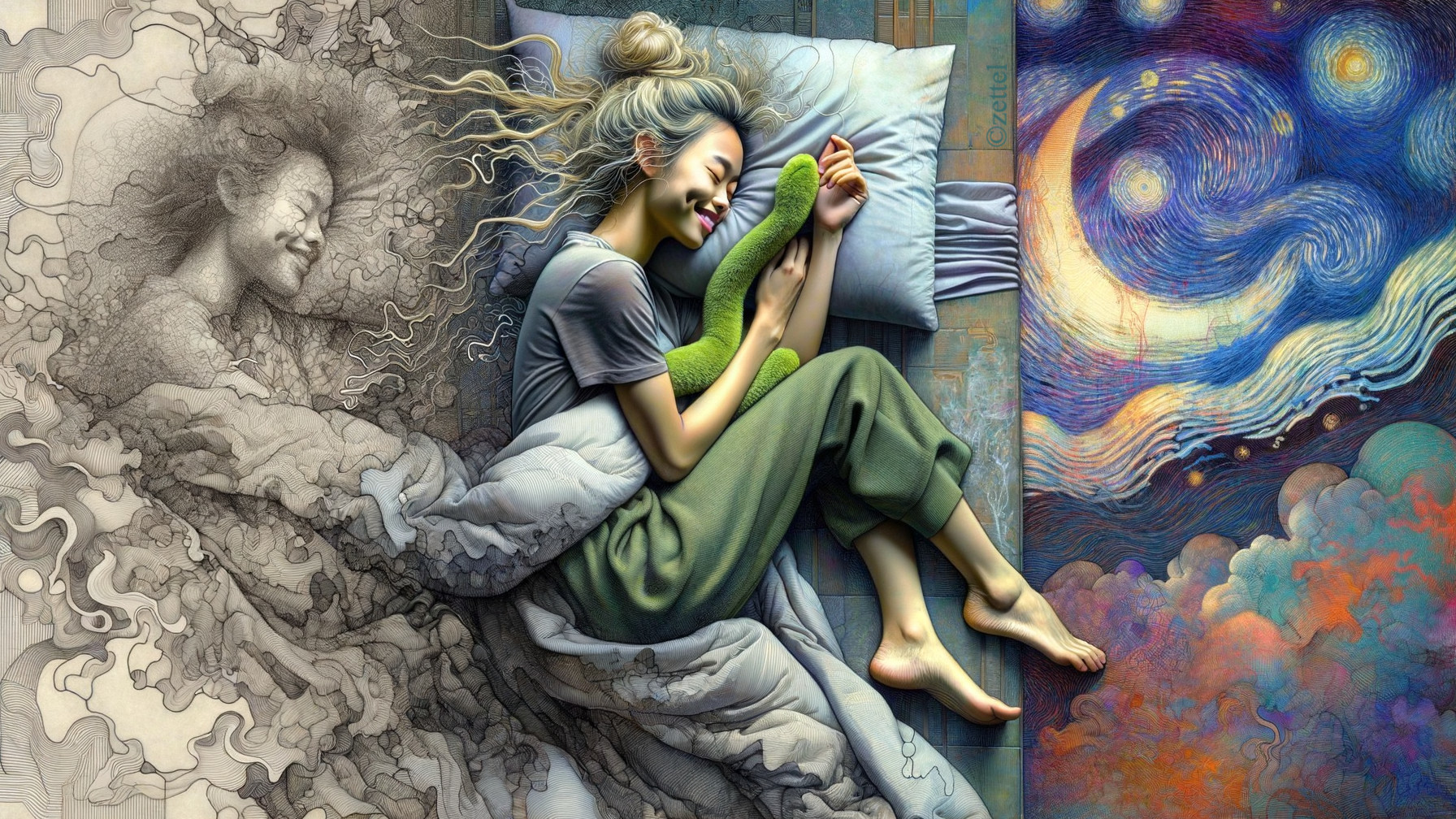 A serene woman with long hair sleeps peacefully, wrapped in a green robe. Surrounding her are vibrant patterns, flowers, and a coiled green snake, evoking a dreamlike, surreal atmosphere.