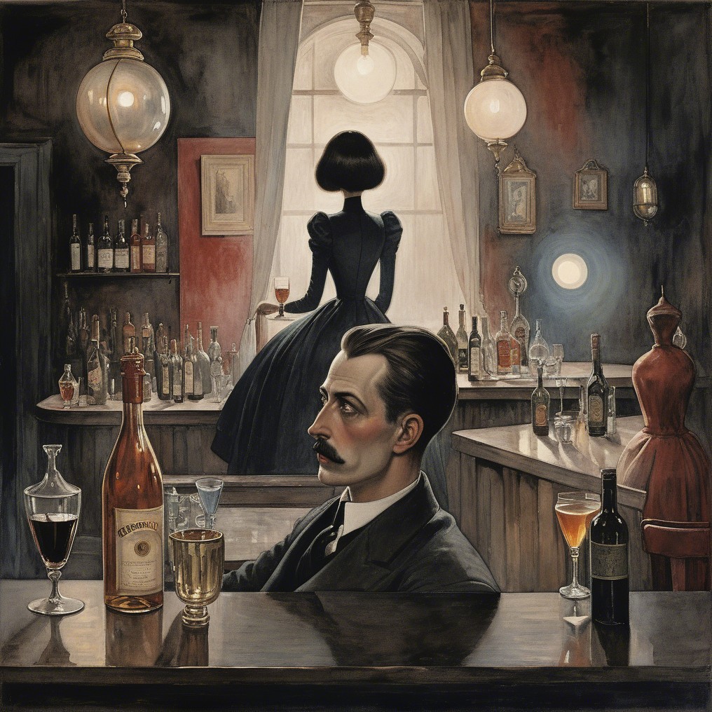 The image features a mysterious bar setting with a tall figure in a black hat and elegant attire standing behind a young, solemn child in a tuxedo. Shelves of bottles line the background.