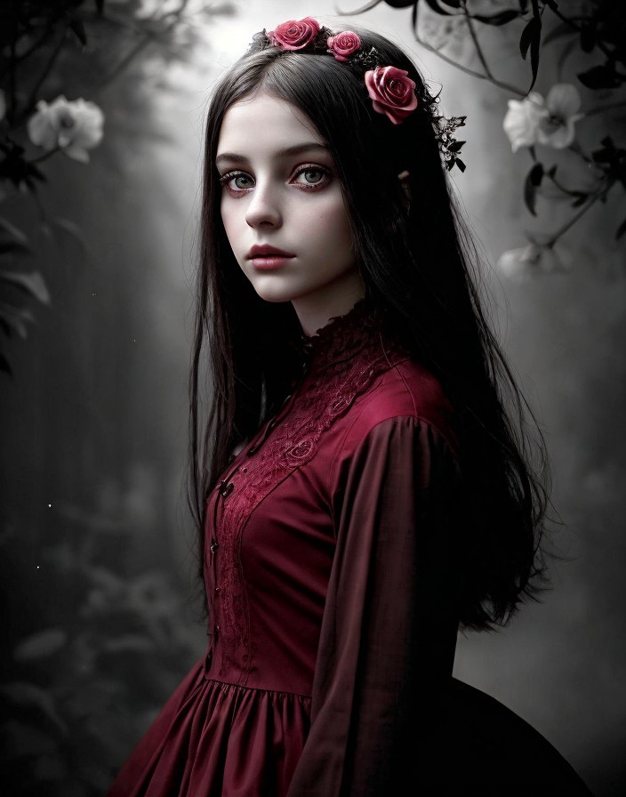 Prompt: ""Extraction" {dystopian dark Fantasy "spiritual child"}[Photograph of young girl in a "scarlet space"]{small skinny anatomy, beautiful eyes}-[high detailed{clothes - hair - flowers}]{eerie ambiance, dark and withe hues with soft shadows, vintage retro flair, surrealistic vibe, delicate features, flowing attire, serene expression, ancient architecture, lush greenery, blurred background, macro photography, surreal splash art, pale translucent skin, hi-res, photorealistic (Nikon Z9, 85mm F1.2, DOF, smooth and realistic HDR, static composition) with a touch of cyberpunk aesthetic, high definition detail, enchanting ambiance, Ultra-realistic portrayal, sharp focus, cinematic lighting}"