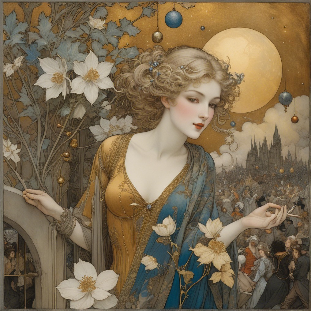 A captivating scene of a woman in elegant attire, holding a goblet, surrounded by enchanting figures. The moon illuminates a whimsical gathering filled with rich textures and warm colors.