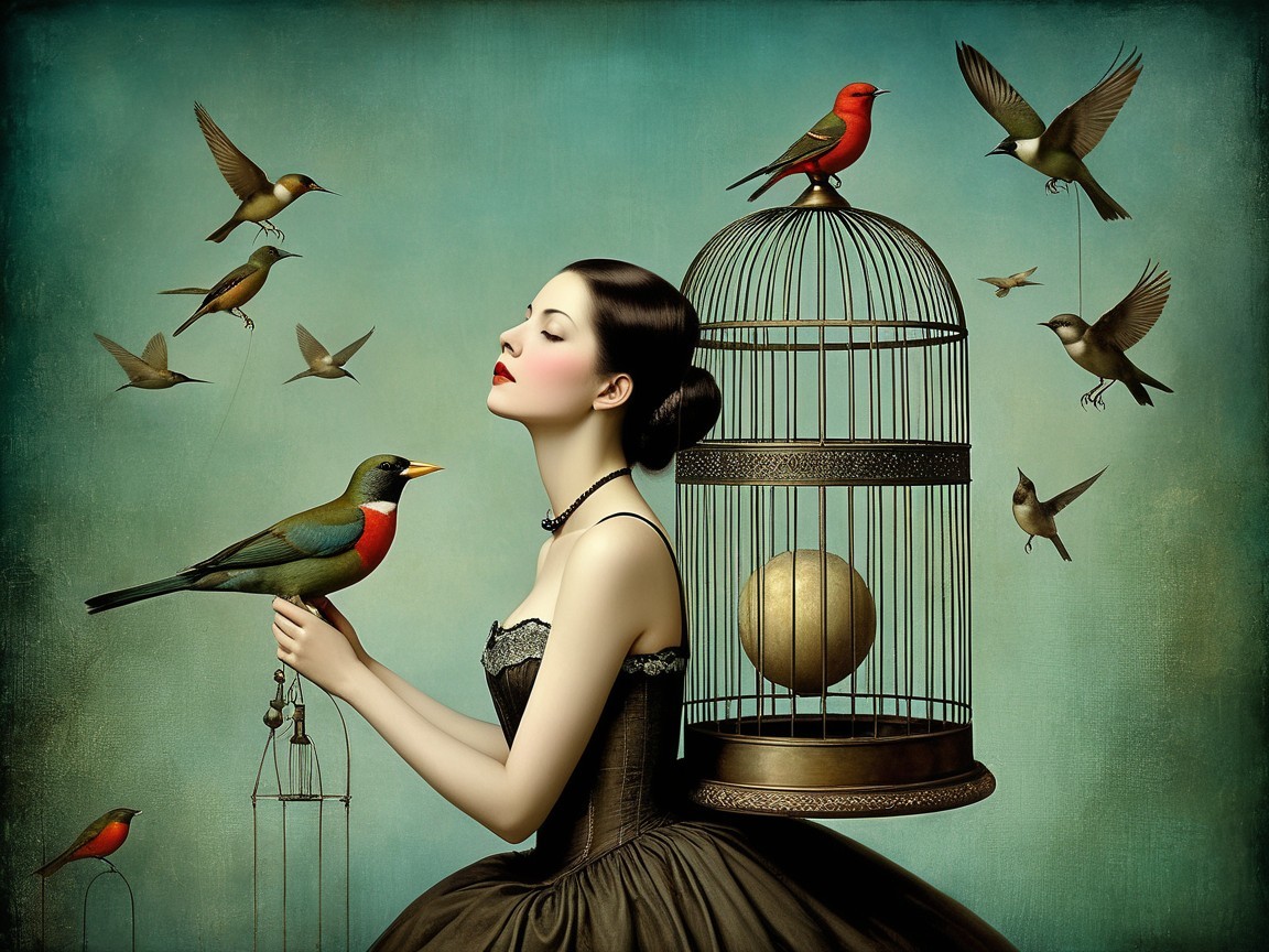 A woman in a vintage gown holds a bird, surrounded by smaller birds in flight. Behind her, a decorative birdcage hints at themes of freedom and confinement, set against a serene background. Original Prompt: Somewho