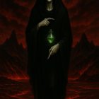 Prompt: Carmen Dell' Orifice/Julie Harris/J.K. Rowling face, beckons with a bony white pointing hand to a small magic vial of glowing green potion, beneath a dark red and black cloudy sky with fiery black mountains a very tall beautiful slender pallid gaunt woman with lovely long drawn out face, thin red lips, and big gaunt cheekbones, wrapped completely in a black robe with hood that half obscures her face in shadow, she floats moving to viewer above across a lake of lava,