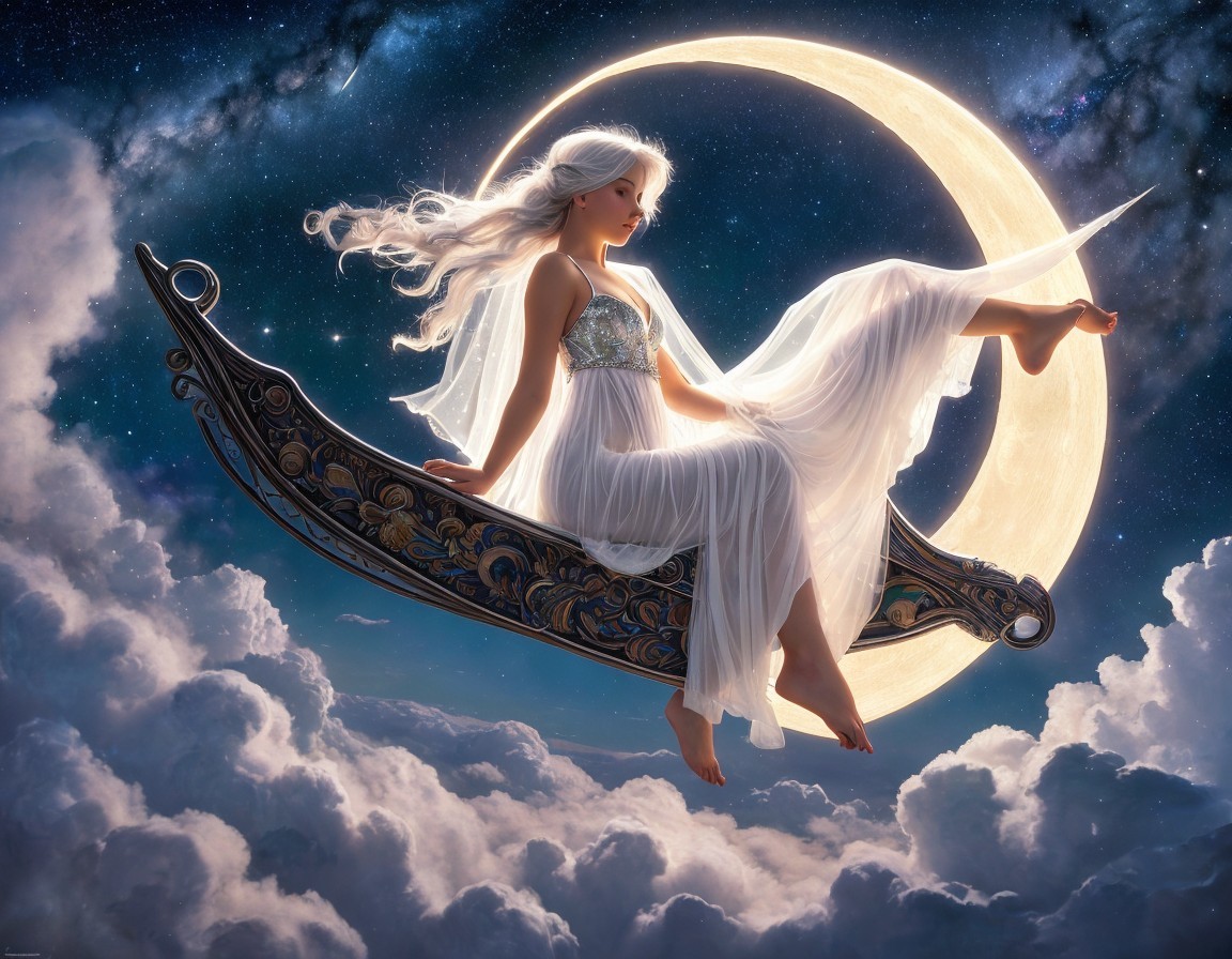 Prompt: "a sensual girl full body in a transparent white peignoir with silver hair riding on the crescent moon flies in the starry sky with the milky way and a magical glow above the cloud"