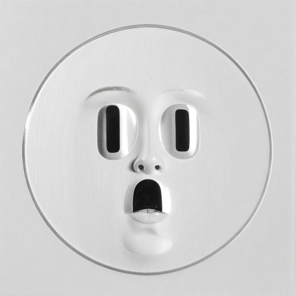 The image features a surreal, dragon-like creature with white scales and large, expressive green eyes, framed by a circular, spiky ring. Its mouth is wide open, enhancing its fantastical appearance.