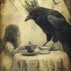 A girl in a delicate dress gazes intently at a crowned raven seated at a small table, with tea set. Surrounding them are birds in a misty, ethereal setting, creating a whimsical atmosphere.